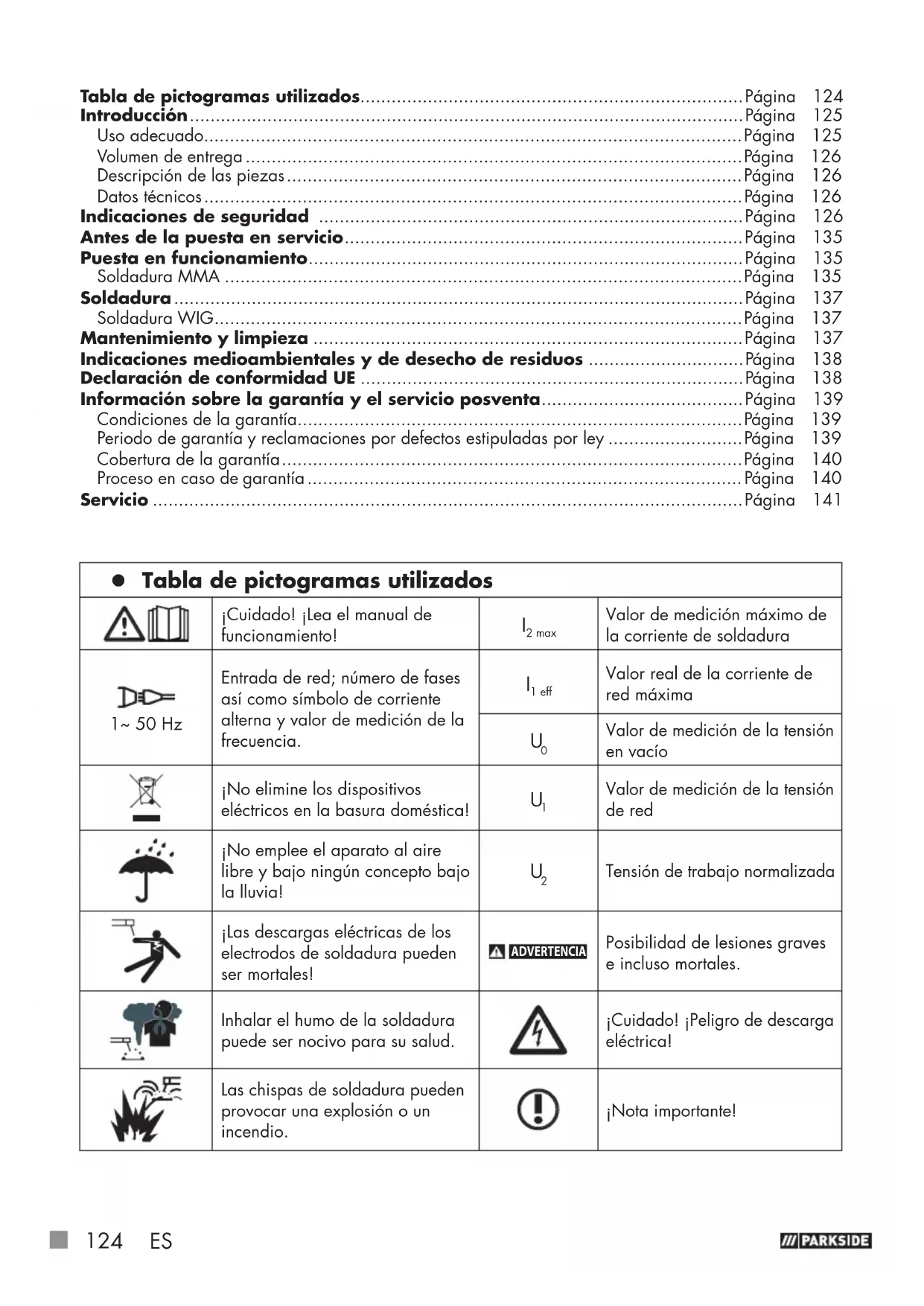 ADVERTENCIA Evite el contacto directo con el circuito eléctrico de soldadura. La tensión en vacío entre la pinza portaelectrodos y la pinza de puesta a tierra puede ser peligrosa, ya que existe peligro de descarga eléctrica. No guarde ni use el aparato en lugares húmedos o mojados ni bajo la lluvia. En este sentido aplica la disposición de protección IP21S. Protéjase los ojos con cristales protectores adecuados para ello (DIN grado 9–10) que deberá fijar a la pantalla de soldadura suministrada. Use guantes y ropa de protección seca libre de aceite y grasa para proteger la piel de la radiación ultravioleta del arco eléctrico.128