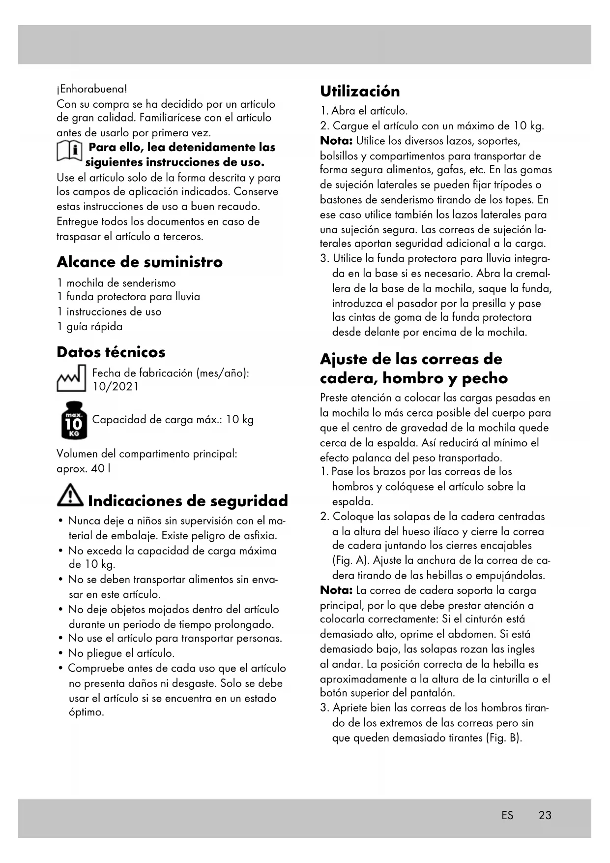 Capacidad de carga máx.: 10 kg Volumen del compartimento principal: aprox. 40 l Indicaciones de seguridad