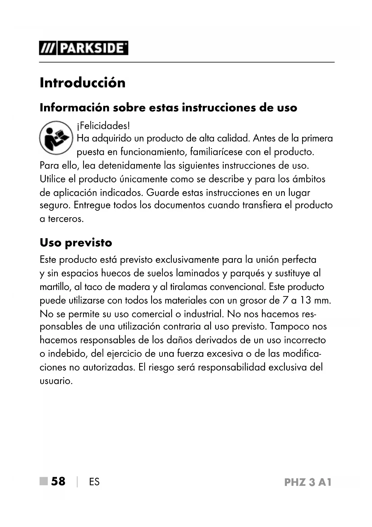 ES Introducción Información sobre estas instrucciones de uso ¡Felicidades! Ha adquirido un producto de alta calidad. Antes de la primera puesta en funcionamiento, familiarícese con el producto. Para ello, lea detenidamente las siguientes instrucciones de uso. Utilice el producto únicamente como se describe y para los ámbitos de aplicación indicados. Guarde estas instrucciones en un lugar seguro. Entregue todos los documentos cuando transfiera el producto a terceros. Uso previsto Este producto está previsto exclusivamente para la unión perfecta y sin espacios huecos de suelos laminados y parqués y sustituye al martillo, al taco de madera y al tiralamas convencional. Este producto puede utilizarse con todos los materiales con un grosor de 7 a 13mm. No se permite su uso comercial o industrial. No nos hacemos res- ponsables de una utilización contraria al uso previsto. Tampoco nos hacemos responsables de los daños derivados de un uso incorrecto o indebido, del ejercicio de una fuerza excesiva o de las modifica- ciones no autorizadas. El riesgo será responsabilidad exclusiva del usuario. IB_380558_PHZ3A1_LB8.indb 58 01.04.2022 13:22:56PHZ 3 A1 ES