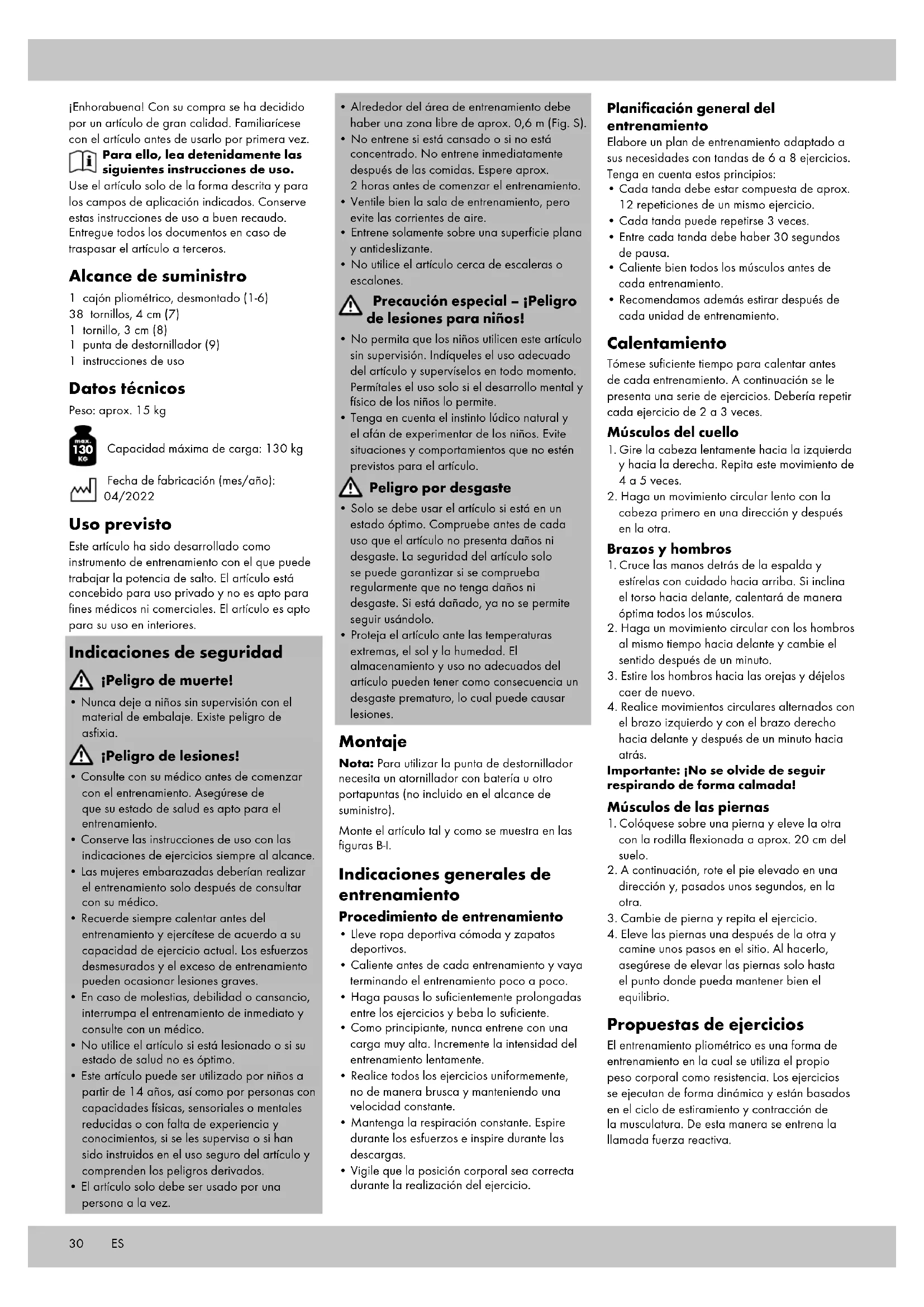 Capacidad máxima de carga: 130 kg Fecha de fabricación (mes/año): 04/2022 Uso previsto Este artículo ha sido desarrollado como instrumento de entrenamiento con el que puede trabajar la potencia de salto. El artículo está concebido para uso privado y no es apto para fines médicos ni comerciales. El artículo es apto para su uso en interiores. Indicaciones de seguridad ¡Peligro de muerte!