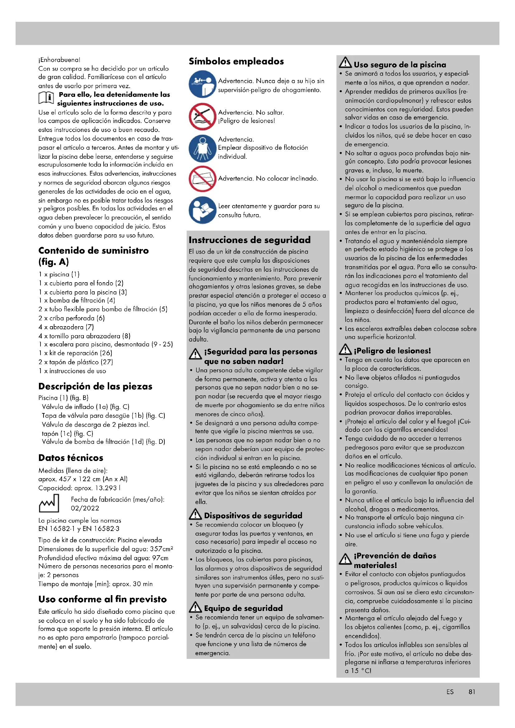 - Obráťte sa na odborníka. Pokyny k likvidácii V záujme ochrany životného prostredia nevyhadzujte svoj výrobok do domáce- ho odpadu, ak doslúžil, ale odneste ho na špecializovanú likvidáciu. O zber- ných miestach a ich otváracích hodinách sa môžete informovať na vašej príslušnej miestnej správe. Výrobok a obal zlikvidujte ekologickým spôsobom. Pri triedení odpadu dodržiavajte označenie obalových materiálov, ktoré sú označené skratkami (a) a číslami (b) s nasledujúcim významom: 1 – 7: plasty/20 – 22: papier a lepenka/ 80 – 98: kompozitné látky. Výrobok a obalové materiály sú recyklovateľné, likvidujte tieto oddelene pre lepšie spracovanie odpadu. Logo Triman je len pre Francúzsko. Možnosti likvidácie doslúženého výrobku sa dozviete na vašej správe obci alebo mesta.81 ¡Enhorabuena! Con su compra se ha decidido por un artículo de gran calidad. Familiarícese con el artículo antes de usarlo por primera vez. Para ello, lea detenidamente las siguientes instrucciones de uso. Use el artículo solo de la forma descrita y para los campos de aplicación indicados. Conserve estas instrucciones de uso a buen recaudo. Entregue todos los documentos en caso de tras- pasar el artículo a terceros. Antes de montar y uti- lizar la piscina debe leerse, entenderse y seguirse escrupulosamente toda la información incluida en esas instrucciones. Estas advertencias, instrucciones y normas de seguridad abarcan algunos riesgos generales de las actividades de ocio en el agua, sin embargo no es posible tratar todos los riesgos y peligros posibles. En todas las actividades en el agua deben prevalecer la precaución, el sentido común y una buena capacidad de juicio. Estos datos deben guardarse para su uso futuro. Contenido de suministro (fig. A) 1 x piscina (1) 1 x cubierta para el fondo (2) 1 x cubierta para la piscina (3) 1 x bomba de filtración (4) 2 x tubo flexible para bomba de filtración (5) 2 x criba perforada (6) 4 x abrazadera (7) 4 x tornillo para abrazadera (8) 1 x escalera para piscina, desmontada (9 - 25) 1 x kit de reparación (26) 2 x tapón de plástico (27) 1 x instrucciones de uso Descripción de las piezas Piscina (1) (fig. B) Válvula de inflado (1a) (fig. C) Tapa de válvula para desagüe (1b) (fig. C) Válvula de descarga de 2 piezas incl. tapón (1c) (fig. C) Válvula de bomba de filtración (1d) (fig. D) Datos técnicos Medidas (llena de aire): aprox. 457 x 122 cm (An x Al) Capacidad: aprox. 13.293 l Fecha de fabricación (mes/año): 02/2022 La piscina cumple las normas EN 16582-1 y EN 16582-3 Tipo de kit de construcción: Piscina elevada Dimensiones de la superficie del agua: 357cm² Profundidad efectiva máxima del agua: 97cm Número de personas necesarias para el monta- je: 2 personas Tiempo de montaje [min]: aprox. 30 min Uso conforme al fin previsto Este artículo ha sido diseñado como piscina que se coloca en el suelo y ha sido fabricado de forma que soporte la presión interna. El artículo no es apto para empotrarlo (tampoco parcial- mente) en el suelo. Símbolos empleados Advertencia. Nunca deje a su hijo sin supervisión-peligro de ahogamiento. Advertencia. No saltar. ¡Peligro de lesiones! Advertencia. Emplear dispositivo de flotación individual. Advertencia. No colocar inclinado. Leer atentamente y guardar para su consulta futura. Instrucciones de seguridad El uso de un kit de construcción de piscina requiere que este cumpla las disposiciones de seguridad descritas en las instrucciones de funcionamiento y mantenimiento. Para prevenir ahogamientos y otras lesiones graves, se debe prestar especial atención a proteger el acceso a la piscina, ya que los niños menores de 5 años podrían acceder a ella de forma inesperada. Durante el baño los niños deberán permanecer bajo la vigilancia permanente de una persona adulta. ¡Seguridad para las personas que no saben nadar!