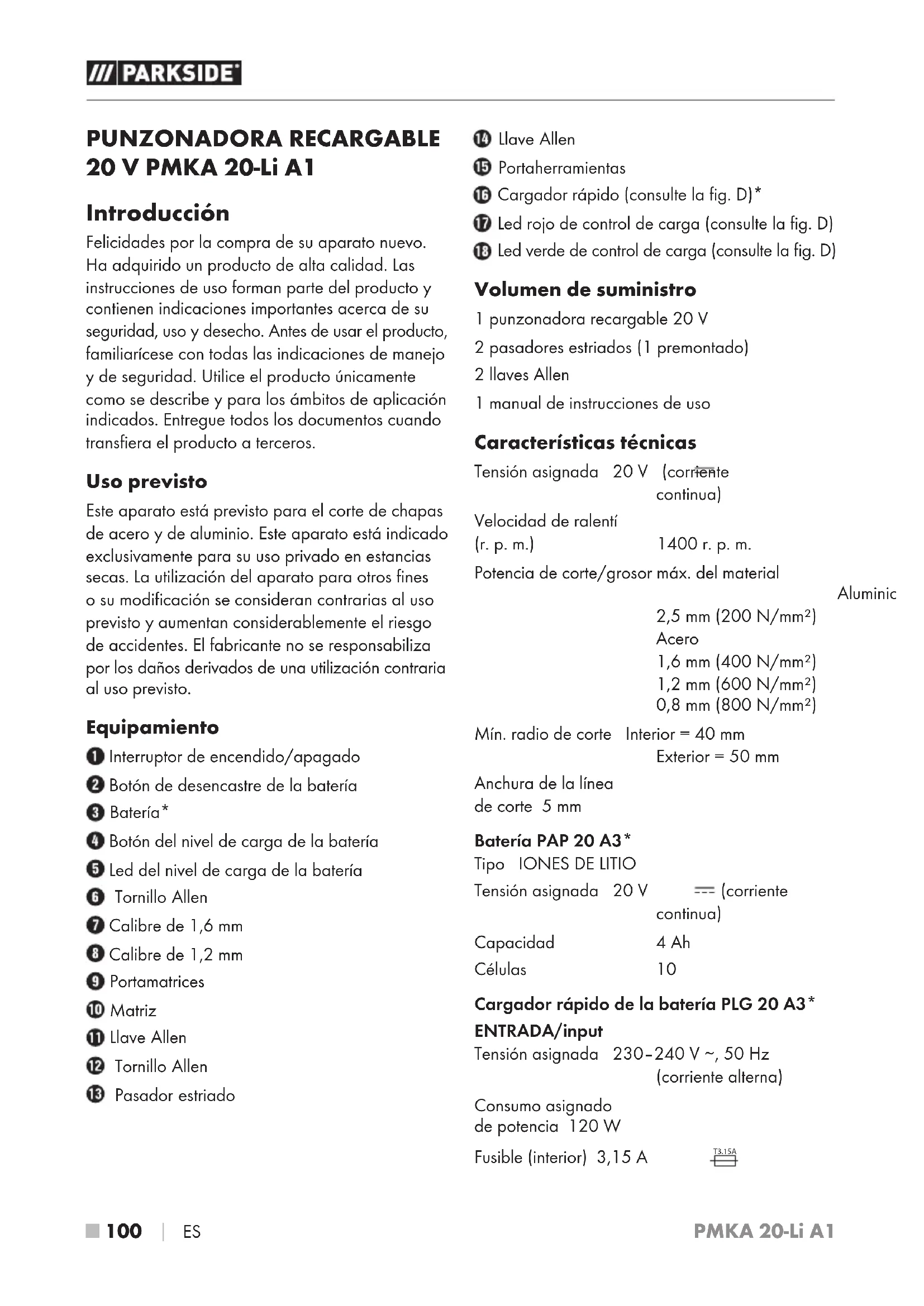 ES PUNZONADORA RECARGABLE 20 V PMKA 20-Li A1 Introducción Felicidades por la compra de su aparato nuevo. Ha adquirido un producto de alta calidad. Las instrucciones de uso forman parte del producto y contienen indicaciones importantes acerca de su seguridad, uso y desecho. Antes de usar el producto, familiarícese con todas las indicaciones de manejo y de seguridad. Utilice el producto únicamente como se describe y para los ámbitos de aplicación indicados. Entregue todos los documentos cuando transfiera el producto a terceros. Uso previsto Este aparato está previsto para el corte de chapas de acero y de aluminio. Este aparato está indicado exclusivamente para su uso privado en estancias secas. La utilización del aparato para otros fines o su modificación se consideran contrarias al uso previsto y aumentan considerablemente el riesgo de accidentes. El fabricante no se responsabiliza por los daños derivados de una utilización contraria al uso previsto. Equipamiento Interruptor de encendido/apagado Botón de desencastre de la batería Batería* Botón del nivel de carga de la batería Led del nivel de carga de la batería Tornillo Allen Calibre de 1,6mm Calibre de 1,2mm Portamatrices Matriz Llave Allen Tornillo Allen Pasador estriado Llave Allen Portaherramientas Cargador rápido (consulte la fig. D)* Led rojo de control de carga (consulte la fig. D) Led verde de control de carga (consulte la fig. D) Volumen de suministro 1 punzonadora recargable 20 V 2 pasadores estriados (1 premontado) 2 llaves Allen 1manual de instrucciones de uso Características técnicas Tensión asignada 20V (corriente continua) Velocidad de ralentí (r.p.m.) 1400r.p.m. Potencia de corte/grosor máx. del material Aluminio 2,5mm (200N/mm²) Acero 1,6mm (400N/mm²) 1,2mm (600N/mm²) 0,8mm (800N/mm²) Mín. radio de corte Interior = 40mm Exterior = 50mm Anchura de la línea de corte 5mm Batería PAP 20 A3* Tipo IONES DE LITIO Tensión asignada 20V (corriente continua) Capacidad 4Ah Células 10 Cargador rápido de la bateríaPLG20A3* ENTRADA/input Tensión asignada 230–240V ∼, 50Hz (corriente alterna) Consumo asignado de potencia 120W Fusible (interior) 3,15A T3.15APMKA 20-Li A1 ES