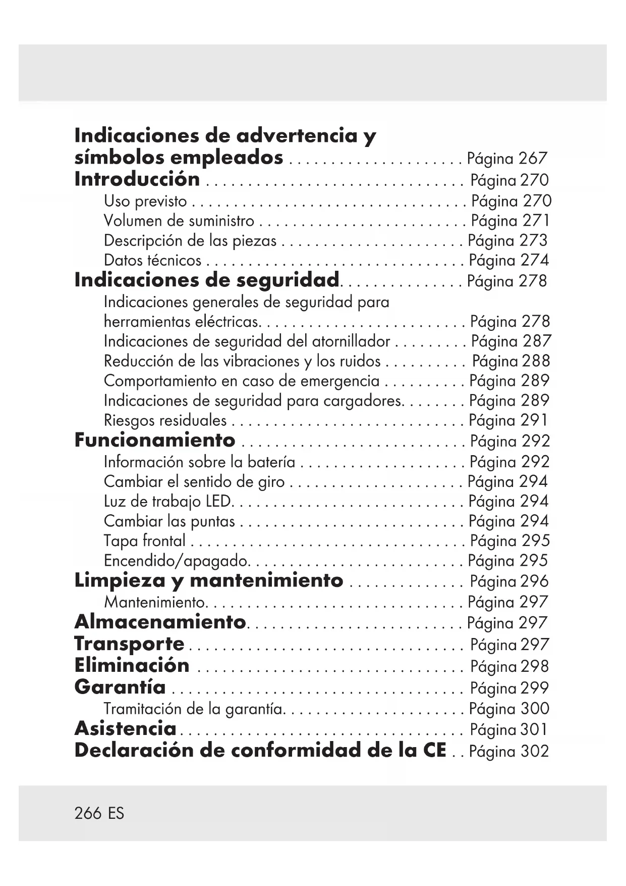 Indicaciones de advertencia y símbolos empleados ..................... Página 267 Introducción ............................... Página 270 Uso previsto ................................. Página 270 Volumen de suministro ......................... Página 271 Descripción de las piezas ...................... Página 273 Datos técnicos ............................... Página 274 Indicaciones de seguridad............... Página 278 Indicaciones generales de seguridad para herramientas eléctricas......................... Página 278 Indicaciones de seguridad del atornillador ......... Página 287 Reducción de las vibraciones y los ruidos . . . . . . . . . . Página 288 Comportamiento en caso de emergencia .......... Página 289 Indicaciones de seguridad para cargadores........ Página 289 Riesgos residuales ............................ Página 291 Funcionamiento ........................... Página 292 Información sobre la batería .................... Página 292 Cambiar el sentido de giro ..................... Página 294 Luz de trabajo LED............................ Página 294 Cambiar las puntas ........................... Página 294 Tapa frontal ................................. Página 295 Encendido/apagado.......................... Página 295 Limpieza y mantenimiento .............. Página 296 Mantenimiento............................... Página 297 Almacenamiento.......................... Página 297 Transporte ................................. Página 297 Eliminación ................................ Página 298 Garantía ................................... Página 299 Tramitación de la garantía...................... Página 300 Asistencia .................................. Página 301 Declaración de conformidad de la CE . . Página 302267