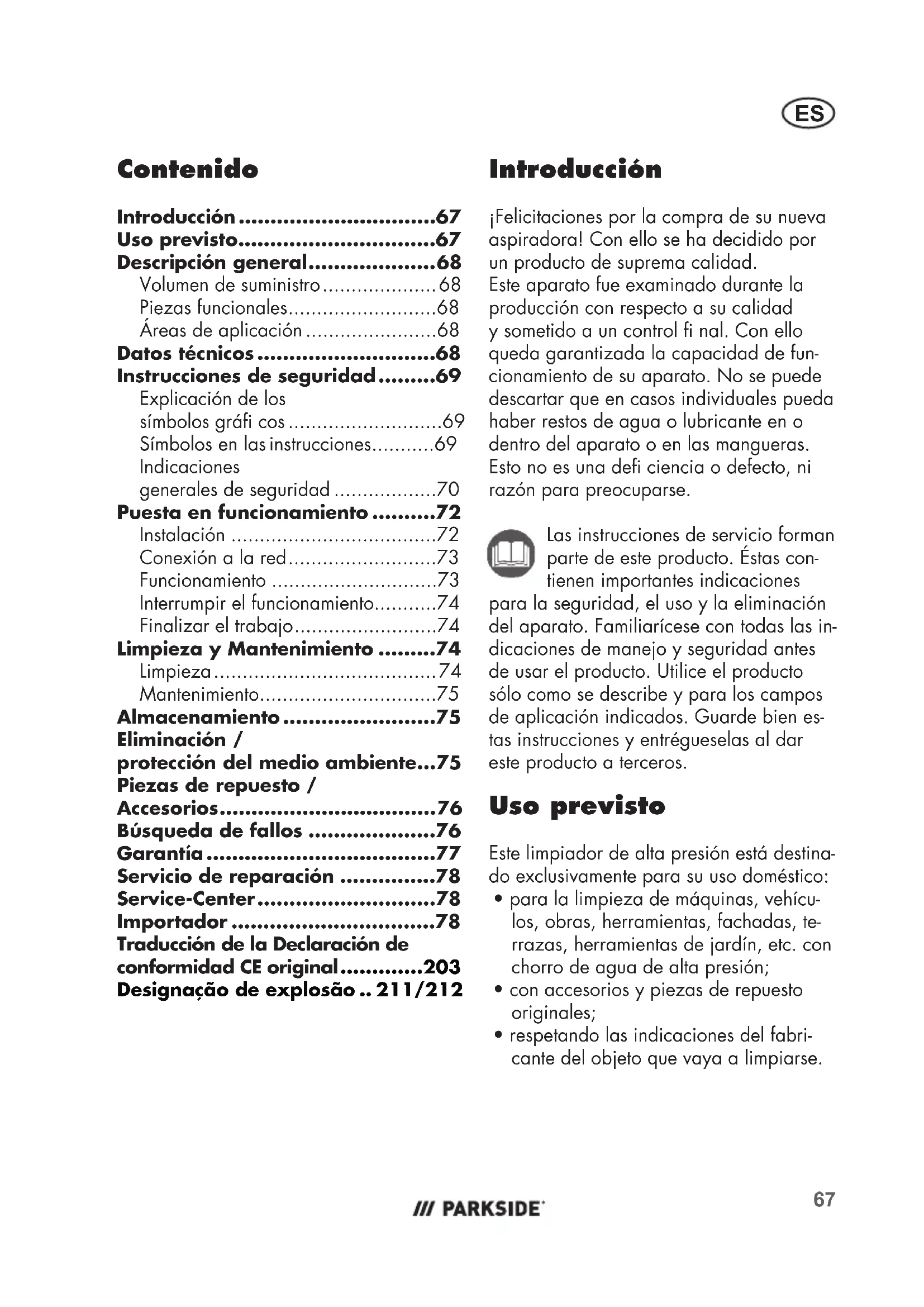 - respetando las indicaciones del fabri- cante del objeto que vaya a limpiarse. Contenido Introducción ...............................67 Uso previsto ...............................67 Descripción general .................... 68 Volumen de suministro .................... 68 Piezas funcionales ..........................68 Áreas de aplicación .......................68 Datos técnicos ............................68 Instrucciones de seguridad .........69 Explicación de los símbolos grá cos ...........................69 Símbolos en las instrucciones ...........69 Indicaciones generales de seguridad ..................70 Puesta en funcionamiento ..........72 Instalación ....................................72 Conexión a la red ..........................73 Funcionamiento .............................73 Interrumpir el funcionamiento...........74 Finalizar el trabajo .........................74 Limpieza y Mantenimiento .........74 Limpieza ....................................... 74 Mantenimiento ...............................75 Almacenamiento ........................75 Eliminación / protección del medio ambiente ... 75 Piezas de repuesto / Accesorios .................................. 76 Búsqueda de fallos ....................76 Garantía ....................................77 Servicio de reparación ...............78 Service-Center ............................78 Importador ................................78 Traducción de la Declaración de conformidad CE original