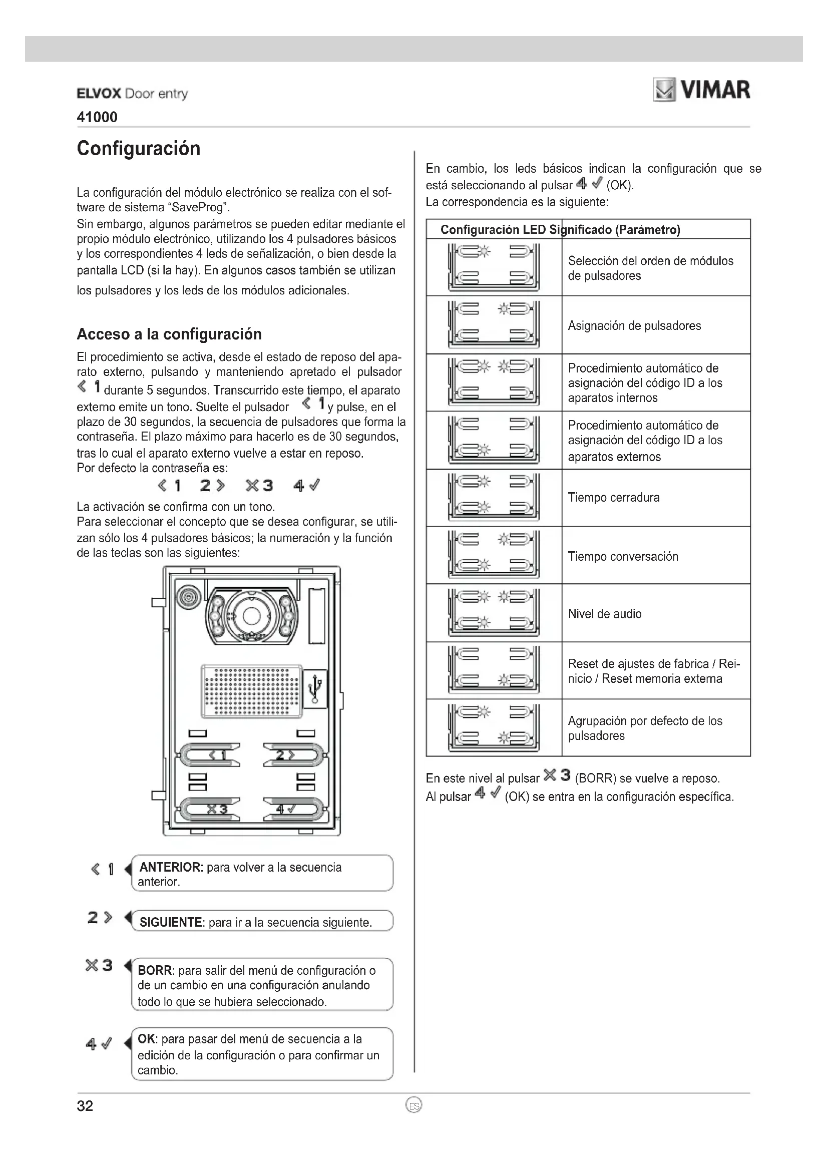 DEEn cambio, los leds básicos indican la conguración que se está seleccionando al pulsar (OK). La correspondencia es la siguiente: Conguración LED Signicado (Parámetro) Selección del orden de módulos de pulsadores Asignación de pulsadores Procedimiento automático de asignación del código ID a los aparatos internos Procedimiento automático de asignación del código ID a los aparatos externos Tiempo cerradura Tiempo conversación Nivel de audio Reset de ajustes de fabrica / Rei- nicio / Reset memoria externa Agrupación por defecto de los pulsadores En este nivel al pulsar (BORR) se vuelve a reposo. Al pulsar (OK) se entra en la conguración especíca. Conguración La conguración del módulo electrónico se realiza con el sof- tware de sistema “SaveProg”. Sin embargo, algunos parámetros se pueden editar mediante el propio módulo electrónico, utilizando los 4 pulsadores básicos y los correspondientes 4 leds de señalización, o bien desde la pantalla LCD (si la hay). En algunos casos también se utilizan los pulsadores y los leds de los módulos adicionales. Acceso a la conguración El procedimiento se activa, desde el estado de reposo del apa- rato externo, pulsando y manteniendo apretado el pulsador durante 5 segundos. Transcurrido este tiempo, el aparato externo emite un tono. Suelte el pulsador y pulse, en el plazo de 30 segundos, la secuencia de pulsadores que forma la contraseña. El plazo máximo para hacerlo es de 30 segundos, tras lo cual el aparato externo vuelve a estar en reposo. Por defecto la contraseña es: La activación se conrma con un tono. Para seleccionar el concepto que se desea congurar, se utili- zan sólo los 4 pulsadores básicos; la numeración y la función de las teclas son las siguientes: ANTERIOR: para volver a la secuencia anterior. SIGUIENTE: para ir a la secuencia siguiente. BORR: para salir del menú de configuración o de un cambio en una configuración anulando todo lo que se hubiera seleccionado. OK: para pasar del menú de secuencia a la edición de la configuración o para confirmar un cambio.