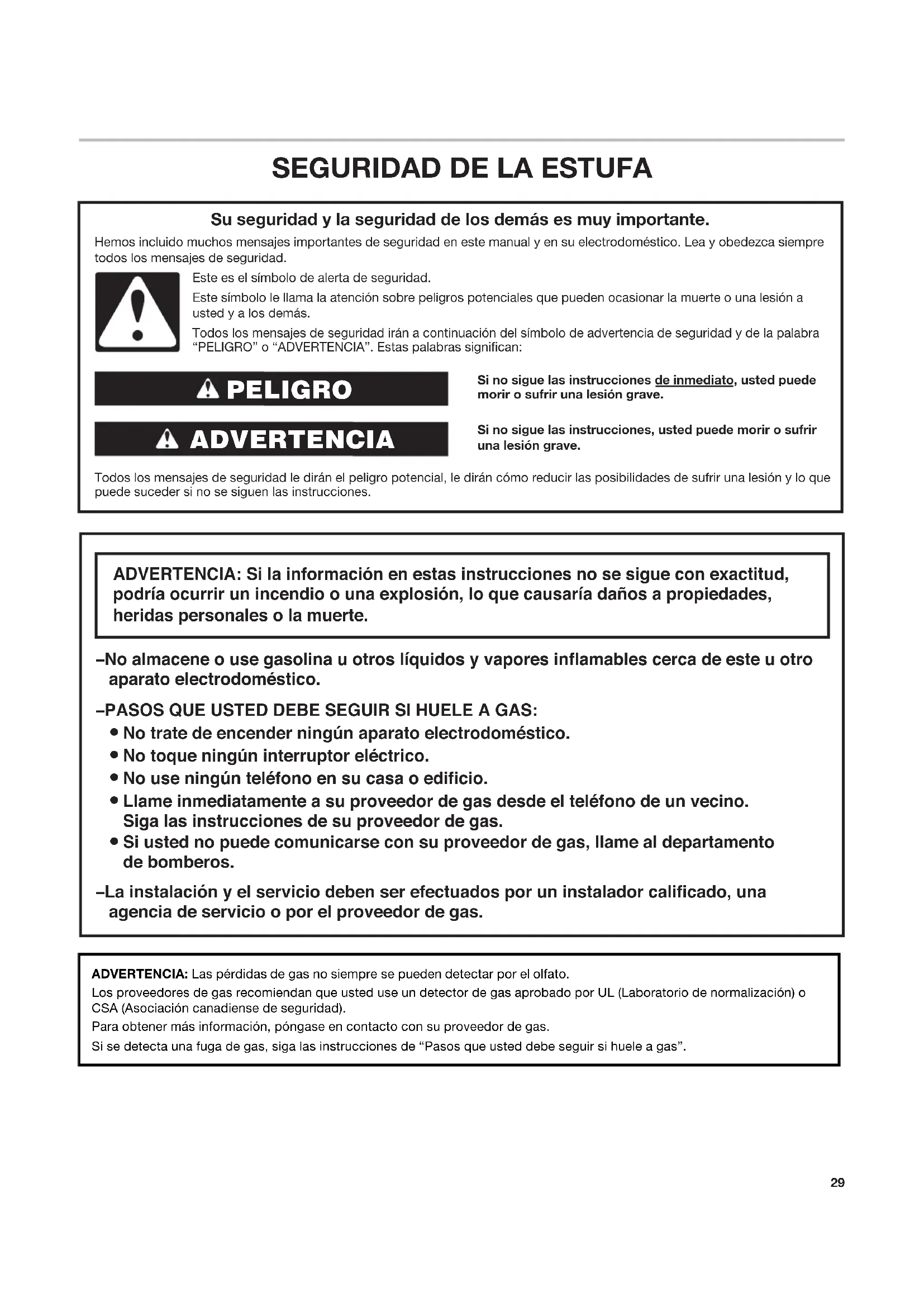 Si no sigue las instrucciones de inmediato, usted puede morir o sufrir una lesión grave. Si no sigue las instrucciones, usted puede morir o sufrir una lesión grave. Todos los mensajes de seguridad le dirán el peligro potencial, le dirán cómo reducir las posibilidades de sufrir una lesión y lo que puede suceder si no se siguen las instrucciones. Su seguridad y la seguridad de los demás es muy importante. Hemos incluido muchos mensajes importantes de seguridad en este manual y en su electrodoméstico. Lea y obedezca siempre todos los mensajes de seguridad. ADVERTENCIA PELIGRO Este es el símbolo de alerta de seguridad. Este símbolo le llama la atención sobre peligros potenciales que pueden ocasionar la muerte o una lesión a usted y a los demás. Todos los mensajes de seguridad irán a continuación del símbolo de advertencia de seguridad y de la palabra “PELIGRO” o “ADVERTENCIA”. Estas palabras significan: ADVERTENCIA: Las pérdidas de gas no siempre se pueden detectar por el olfato. Los proveedores de gas recomiendan que usted use un detector de gas aprobado por UL (Laboratorio de normalización) o CSA (Asociación canadiense de seguridad). Para obtener más información, póngase en contacto con su proveedor de gas. Si se detecta una fuga de gas, siga las instrucciones de “Pasos que usted debe seguir si huele a gas”. ADVERTENCIA: Si la información en estas instrucciones no se sigue con exactitud, podría ocurrir un incendio o una explosión, lo que causaría daños a propiedades, heridas personales o la muerte. – No almacene o use gasolina u otros líquidos y vapores inflamables cerca de este u otro aparato electrodoméstico. – PASOS QUE USTED DEBE SEGUIR SI HUELE A GAS: