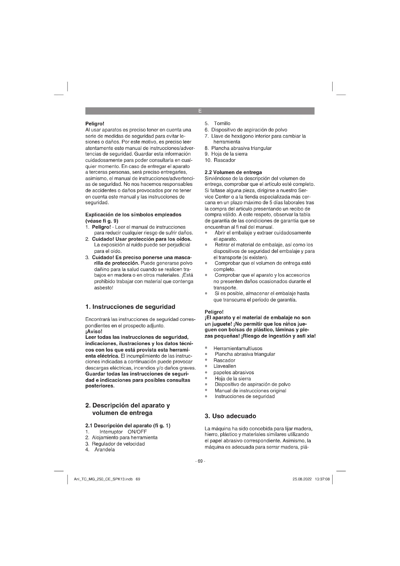La máquina ha sido concebida para lijar madera, hierro, plástico y materiales similares utilizando el papel abrasivo correspondiente. Asimismo, la máquina es adecuada para serrar madera, plá- Anl_TC_MG_250_CE_SPK13.indb 69Anl_TC_MG_250_CE_SPK13.indb 69 25.08.2022 13:37:0825.08.2022 13:37:08E