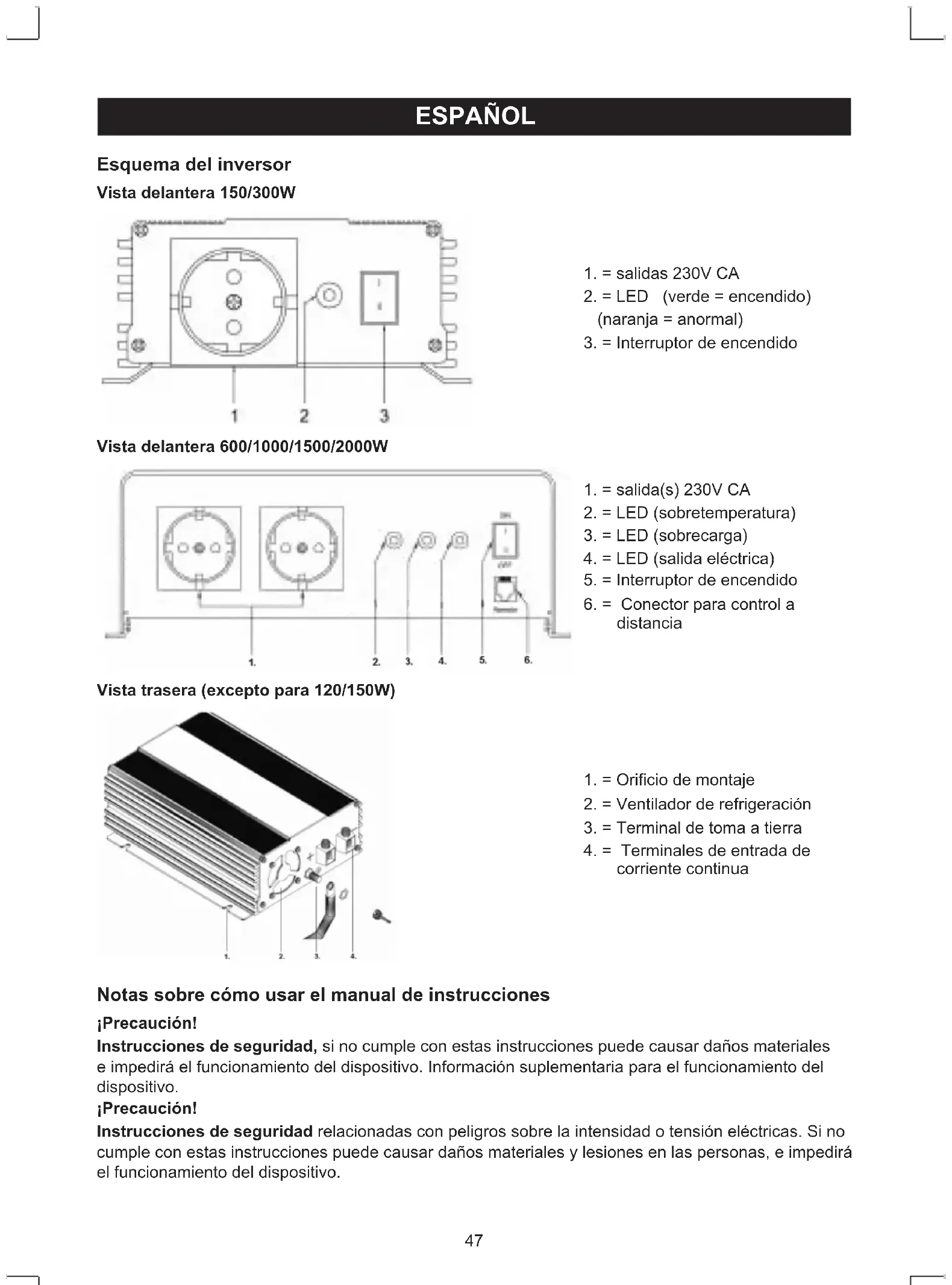3.=Terminaldetomaatierra 4.=Terminalesdeentradade corriente continua Notas sobre cómo usar el manual de instrucciones ¡Precaución! Instrucciones de seguridad, si no cumple con estas instrucciones puede causar daños materiales eimpediráelfuncionamientodeldispositivo.Informaciónsuplementariaparaelfuncionamientodel dispositivo. ¡Precaución! Instrucciones de seguridad relacionadas con peligros sobre la intensidad o tensión eléctricas. Si no cumpleconestasinstruccionespuedecausardañosmaterialesylesionesenlaspersonas,eimpedirá el funcionamiento del dispositivo.48 Instrucciones generales de seguridad