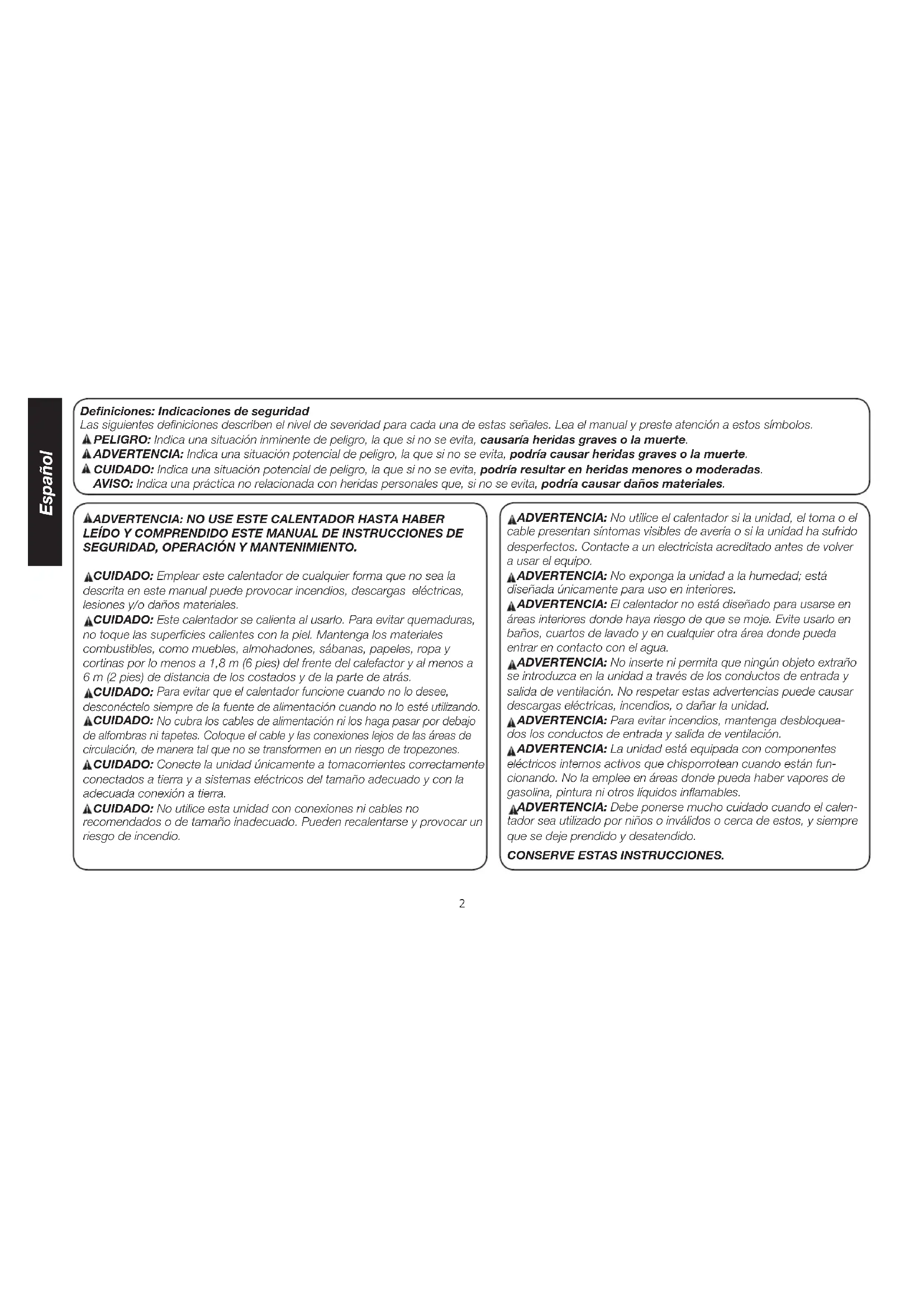 ADVERTENCIA: No utilice el calentador si la unidad, el toma o el cable presentan síntomas visibles de avería o si la unidad ha sufrido desperfectos. Contacte a un electricista acreditado antes de volver a usar el equipo. ADVERTENCIA: No exponga la unidad a la humedad; está diseñada únicamente para uso en interiores. ADVERTENCIA: El calentador no está diseñado para usarse en áreas interiores donde haya riesgo de que se moje. Evite usarlo en baños, cuartos de lavado y en cualquier otra área donde pueda entrar en contacto con el agua. ADVERTENCIA: No inserte ni permita que ningún objeto extraño se introduzca en la unidad a través de los conductos de entrada y salida de ventilación. No respetar estas advertencias puede causar descargas eléctricas, incendios, o dañar la unidad. ADVERTENCIA: Para evitar incendios, mantenga desbloquea- dos los conductos de entrada y salida de ventilación. ADVERTENCIA: La unidad está equipada con componentes eléctricos internos activos que chisporrotean cuando están fun- cionando. No la emplee en áreas donde pueda haber vapores de gasolina, pintura ni otros líquidos inflamables. ADVERTENCIA: Debe ponerse mucho cuidado cuando el calen- tador sea utilizado por niños o inválidos o cerca de estos, y siempre que se deje prendido y desatendido. CONSERVE ESTAS INSTRUCCIONES. ADVERTENCIA: NO USE ESTE CALENTADOR HASTA HABER LEÍDO Y COMPRENDIDO ESTE MANUAL DE INSTRUCCIONES DE SEGURIDAD, OPERACIÓN Y MANTENIMIENTO. CUIDADO: Emplear este calentador de cualquier forma que no sea la descrita en este manual puede provocar incendios, descargas eléctricas, lesiones y/o daños materiales. CUIDADO: Este calentador se calienta al usarlo. Para evitar quemaduras, no toque las superficies calientes con la piel. Mantenga los materiales combustibles, como muebles, almohadones, sábanas, papeles, ropa y cortinas por lo menos a 1,8 m (6 pies) del frente del calefactor y al menos a 6 m (2 pies) de distancia de los costados y de la parte de atrás. CUIDADO: Para evitar que el calentador funcione cuando no lo desee, desconéctelo siempre de la fuente de alimentación cuando no lo esté utilizando. CUIDADO: No cubra los cables de alimentación ni los haga pasar por debajo de alfombras ni tapetes. Coloque el cable y las conexiones lejos de las áreas de circulación, de manera tal que no se transformen en un riesgo de tropezones. CUIDADO: Conecte la unidad únicamente a tomacorrientes correctamente conectados a tierra y a sistemas eléctricos del tamaño adecuado y con la adecuada conexión a tierra. CUIDADO: No utilice esta unidad con conexiones ni cables no recomendados o de tamaño inadecuado. Pueden recalentarse y provocar un riesgo de incendio. Definiciones: Indicaciones de seguridad Las siguientes definiciones describen el nivel de severidad para cada una de estas señales. Lea el manual y preste atención a estos símbolos. PELIGRO: Indica una situación inminente de peligro, la que si no se evita, causaría heridas graves o la muerte. ADVERTENCIA: Indica una situación potencial de peligro, la que si no se evita, podría causar heridas graves o la muerte. CUIDADO: Indica una situación potencial de peligro, la que si no se evita, podría resultar en heridas menores o moderadas. AVISO: Indica una práctica no relacionada con heridas personales que, si no se evita, podría causar daños materiales.Español