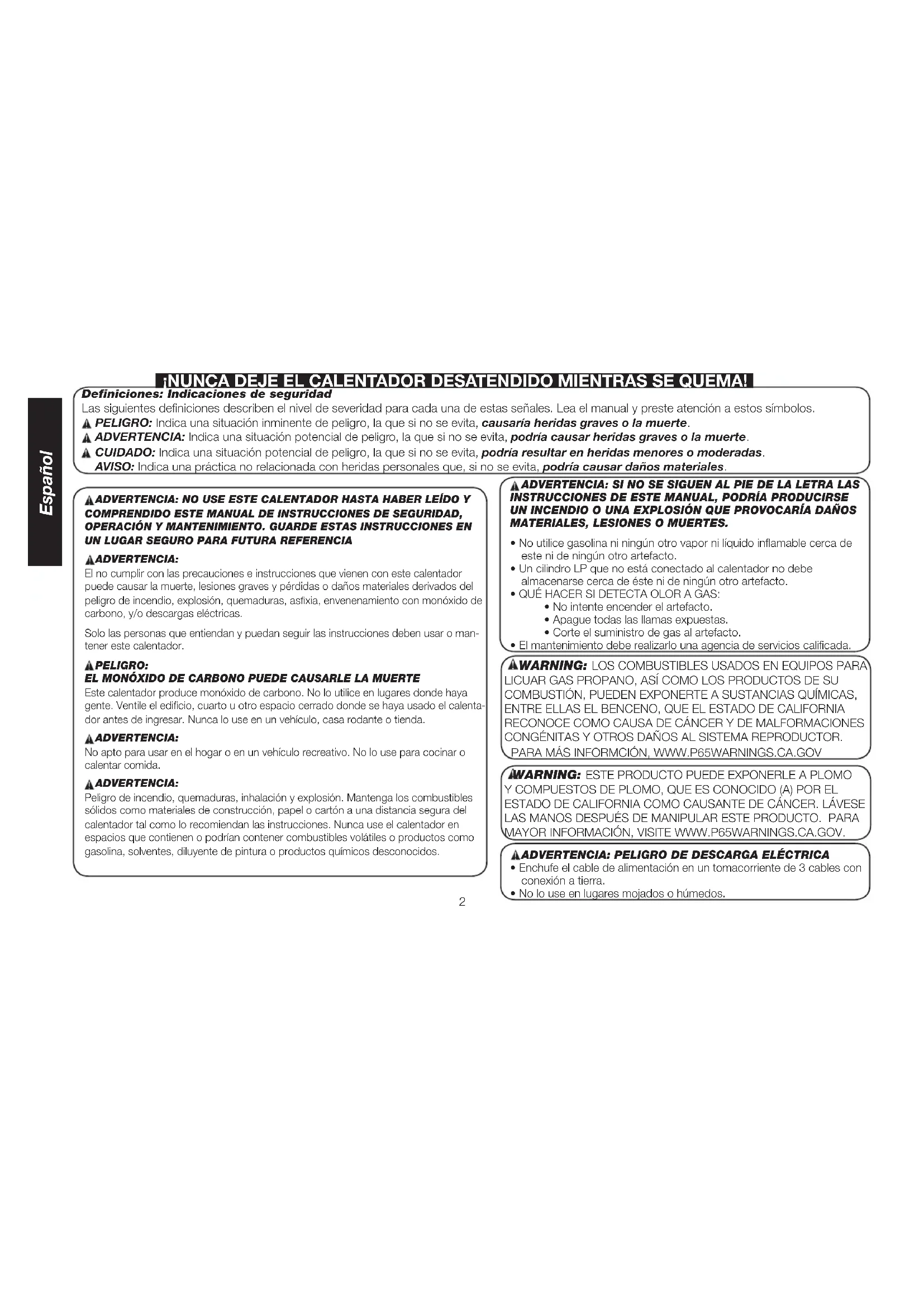 ADVERTENCIA: NO USE ESTE CALENTADOR HASTA HABER LEÍDO Y COMPRENDIDO ESTE MANUAL DE INSTRUCCIONES DE SEGURIDAD, OPERACIÓN Y MANTENIMIENTO. GUARDE ESTAS INSTRUCCIONES EN UN LUGAR SEGURO PARA FUTURA REFERENCIA ADVERTENCIA:El no cumplir con las precauciones e instrucciones que vienen con este calentador puede causar la muerte, lesiones graves y pérdidas o daños materiales derivados del peligro de incendio, explosión, quemaduras, asxia, envenenamiento con monóxido de carbono, y/o descargas eléctricas.Solo las personas que entiendan y puedan seguir las instrucciones deben usar o man-tener este calentador. PELIGRO:EL MONÓXIDO DE CARBONO PUEDE CAUSARLE LA MUERTEEste calentador produce monóxido de carbono. No lo utilice en lugares donde haya gente. Ventile el edicio, cuarto u otro espacio cerrado donde se haya usado el calenta-dor antes de ingresar. Nunca lo use en un vehículo, casa rodante o tienda. ADVERTENCIA:No apto para usar en el hogar o en un vehículo recreativo. No lo use para cocinar o calentar comida. ADVERTENCIA:Peligro de incendio, quemaduras, inhalación y explosión. Mantenga los combustibles sólidos como materiales de construcción, papel o cartón a una distancia segura del calentador tal como lo recomiendan las instrucciones. Nunca use el calentador en espacios que contienen o podrían contener combustibles volátiles o productos como gasolina, solventes, diluyente de pintura o productos químicos desconocidos. ADVERTENCIA: SI NO SE SIGUEN AL PIE DE LA LETRA LAS INSTRUCCIONES DE ESTE MANUAL, PODRÍA PRODUCIRSE UN INCENDIO O UNA EXPLOSIÓN QUE PROVOCARÍA DAÑOS MATERIALES, LESIONES O MUERTES.