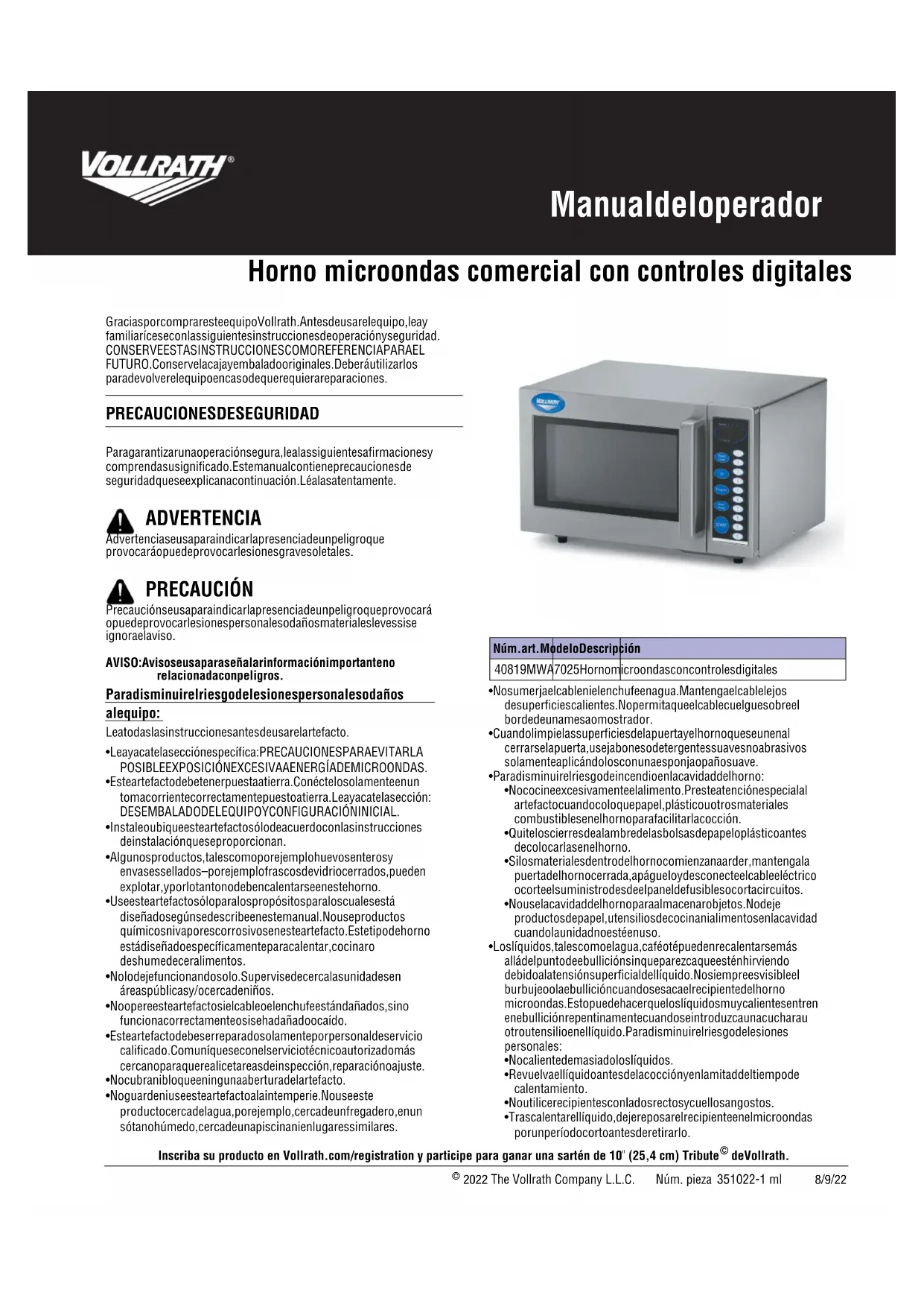 40819 - Microondas Vollrath - Manual de uso y guía de instrucciones gratis