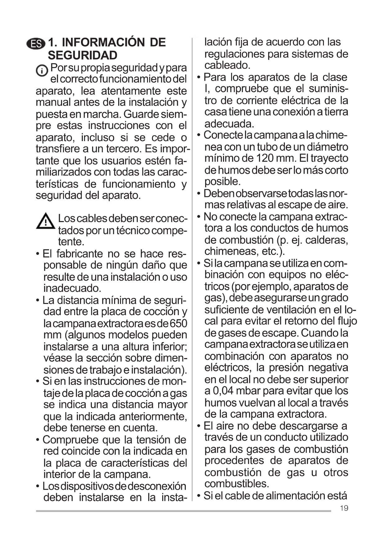 - Si la campana se utiliza en com- binación con equipos no eléc- tricos (por ejemplo, aparatos de gas), debe asegurarse un grado sucientedeventilaciónenello- calparaevitarelretornodelujo de gases de escape. Cuando la campana extractora se utiliza en combinación con aparatos no eléctricos, la presión negativa en el local no debe ser superior a 0,04 mbar para evitar que los humos vuelvan al local a través de la campana extractora.