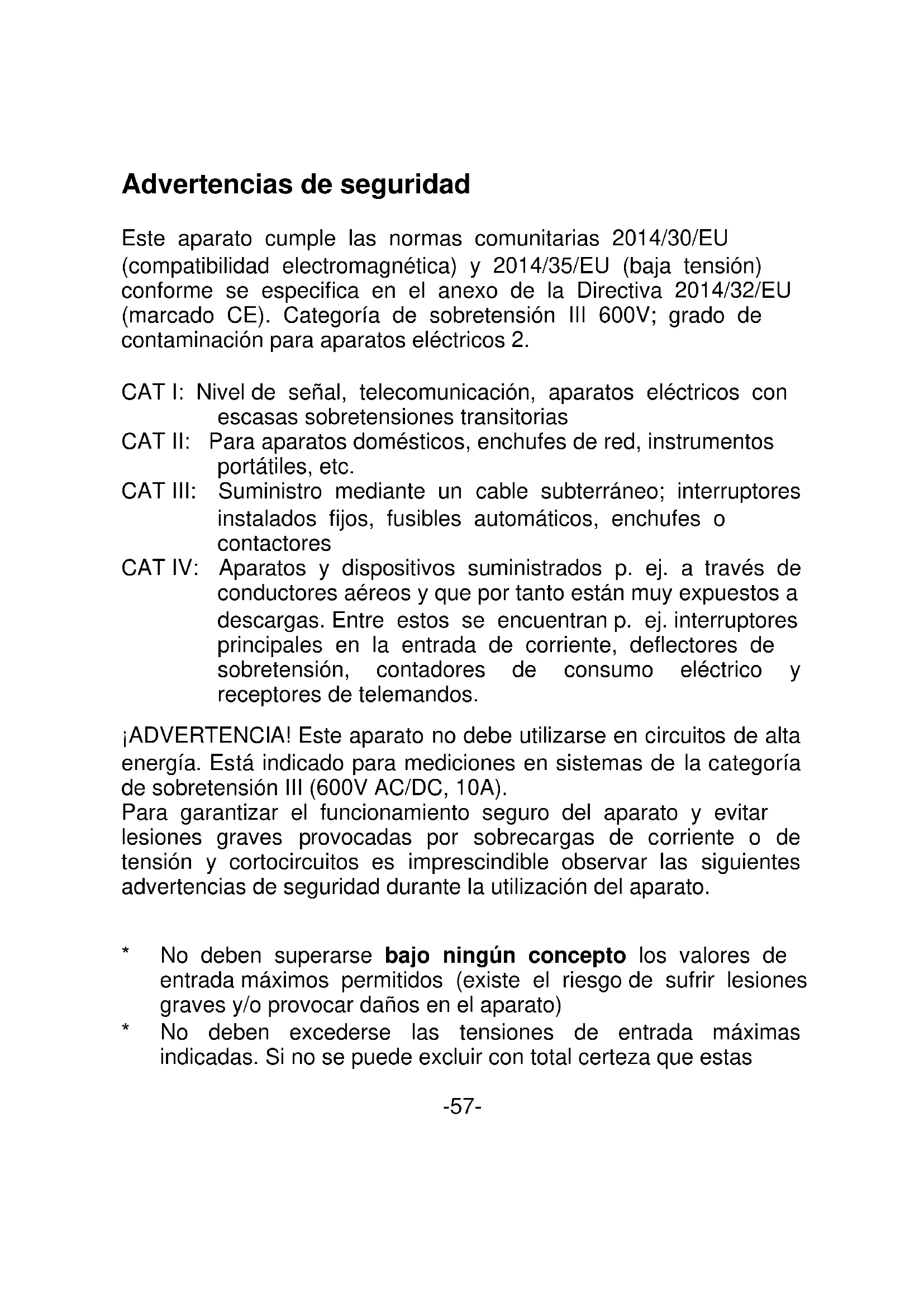 -56-Advertencias de seguridad Este aparato cumple las normas comunitarias 2014/30/EU (compatibilidad electromagnética) y 2014/35/EU (baja tensión) conforme se especifica en el anexo de la Directiva 2014/32/EU (marcado CE). Categoría de sobretensión III 600V; grado de contaminación para aparatos eléctricos 2. CAT I: Nivel de señal, telecomunicación, aparatos eléctricos con escasas sobretensiones transitorias CAT II: Para aparatos domésticos, enchufes de red, instrumentos portátiles, etc. CAT III: Suministro mediante un cable subterráneo; interruptores instalados fijos, fusibles automáticos, enchufes o contactores CAT IV: Aparatos y dispositivos suministrados p. ej. a través de conductores aéreos y que por tanto están muy expuestos a descargas. Entre estos se encuentran p. ej. interruptores principales en la entrada de corriente, deflectores de sobretensión, contadores de consumo eléctrico y receptores de telemandos. ¡ADVERTENCIA! Este aparato no debe utilizarse en circuitos de alta energía. Está indicado para mediciones en sistemas de la categoría de sobretensión III (600V AC/DC, 10A). Para garantizar el funcionamiento seguro del aparato y evitar lesiones graves provocadas por sobrecargas de corriente o de tensión y cortocircuitos es imprescindible observar las siguientes advertencias de seguridad durante la utilización del aparato.