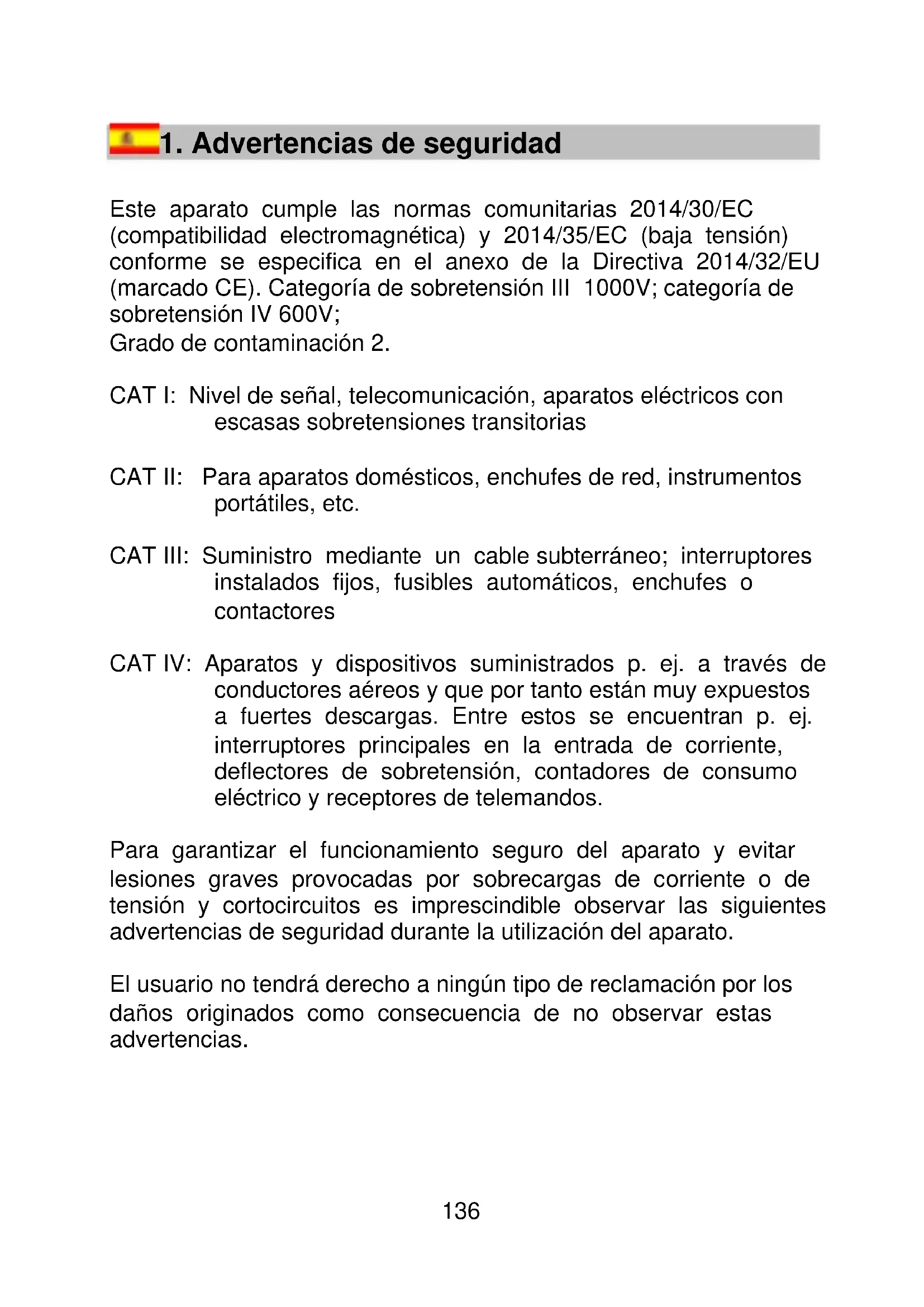 Este aparato cumple las normas comunitarias 2014/30/EC (compatibilidad electromagnética) y 2014/35/EC (baja tensión) conforme se especifica en el anexo de la Directiva 2014/32/EU (marcado CE). Categoría de sobretensión III 1000V; categoría de sobretensión IV 600V; Grado de contaminación 2. CAT I: Nivel de señal, telecomunicación, aparatos eléctricos con escasas sobretensiones transitorias CAT II: Para aparatos domésticos, enchufes de red, instrumentos portátiles, etc. CAT III: Suministro mediante un cable subterráneo; interruptores instalados fijos, fusibles automáticos, enchufes o contactores CAT IV: Aparatos y dispositivos suministrados p. ej. a través de conductores aéreos y que por tanto están muy expuestos a fuertes descargas. Entre estos se encuentran p. ej. interruptores principales en la entrada de corriente, deflectores de sobretensión, contadores de consumo eléctrico y receptores de telemandos. Para garantizar el funcionamiento seguro del aparato y evitar lesiones graves provocadas por sobrecargas de corriente o de tensión y cortocircuitos es imprescindible observar las siguientes advertencias de seguridad durante la utilización del aparato. El usuario no tendrá derecho a ningún tipo de reclamación por los daños originados como consecuencia de no observar estas advertencias.137