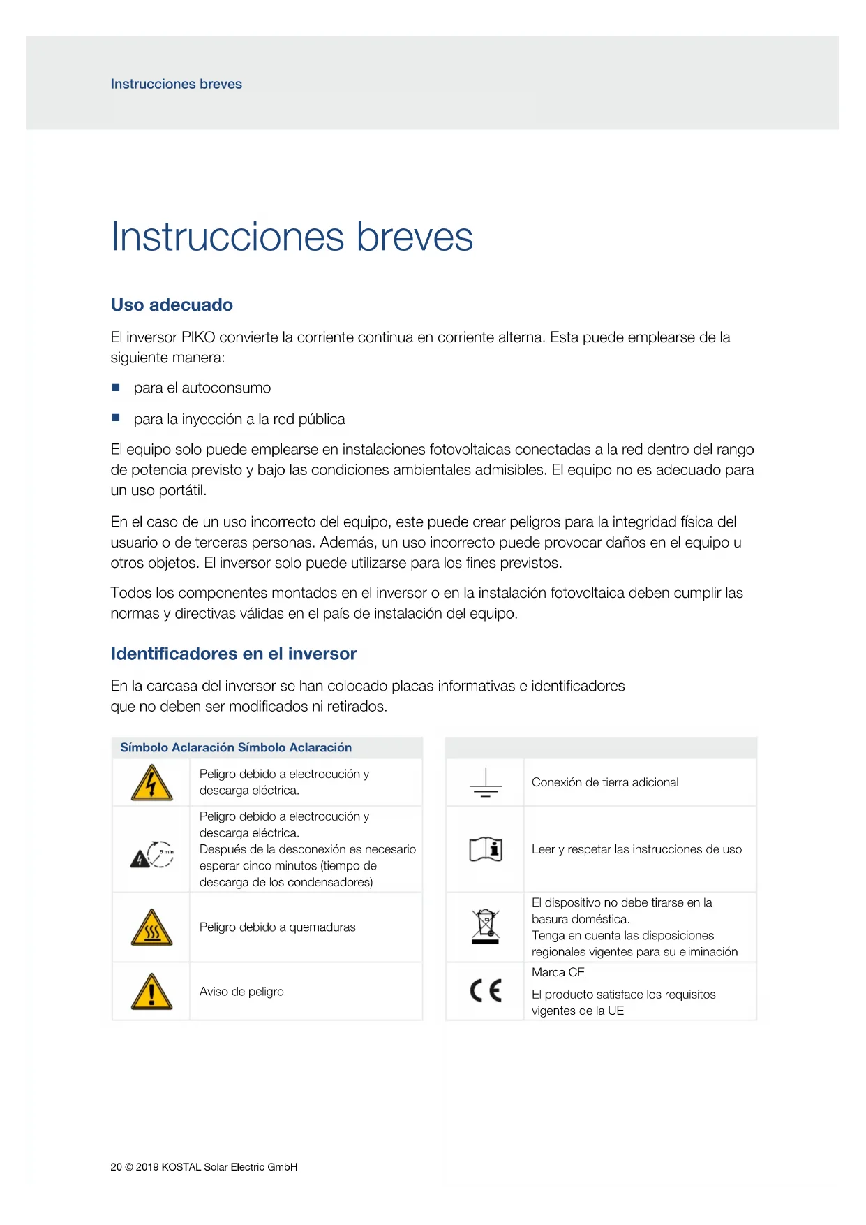 para la inyección a la red pública El equipo solo puede emplearse en instalaciones fotovoltaicas conectadas a la red dentro del rango de potencia previsto y bajo las condiciones ambientales admisibles. El equipo no es adecuado para un uso portátil. En el caso de un uso incorrecto del equipo, este puede crear peligros para la integridad física del usuario o de terceras personas. Además, un uso incorrecto puede provocar daños en el equipo u otros objetos. El inversor solo puede utilizarse para los fines previstos. Todos los componentes montados en el inversor o en la instalación fotovoltaica deben cumplir las normas y directivas válidas en el país de instalación del equipo. Identificadores en el inversor En la carcasa del inversor se han colocado placas informativas e identificadores que no deben ser modificados ni retirados. Símbolo Aclaración Símbolo Aclaración Peligro debido a electrocución y descarga eléctrica. Conexión de tierra adicional 5 min Peligro debido a electrocución y descarga eléctrica. Después de la desconexión es necesario esperar cinco minutos (tiempo de descarga de los condensadores) Leer y respetar las instrucciones de uso 5 min Peligro debido a quemaduras El dispositivo no debe tirarse en la basura doméstica. Tenga en cuenta las disposiciones regionales vigentes para su eliminación Aviso de peligro Marca CE El producto satisface los requisitos vigentes de la UE© 2019 KOSTAL Solar Electric GmbH 21