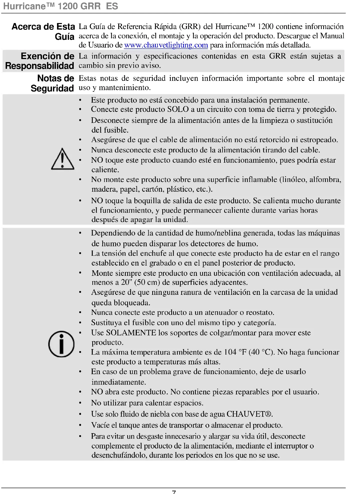 La Guía de Referencia Rápida (GRR) del Hurricane™ 1200 contiene información acerca de la conexión, el montaje y la operación del producto. Descargue el Manual de Usuario de www.chauvetlighting.com para información más detallada. Exención de Responsabilidad La información y especificaciones contenidas en esta GRR están sujetas a cambio sin previo aviso. Notas de Seguridad Estas notas de seguridad incluyen información importante sobre el montaje, uso y mantenimiento.