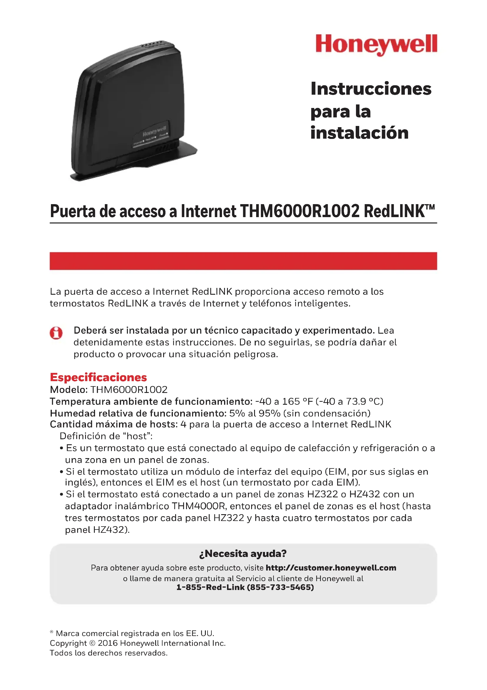 Le fonctionnement est soumis à deux conditions : 1 Ce dispositif ne doit pas causer d’interférences, et 2 Ce dispositif doit accepter toutes les interférences, y compris celles pouvant causer un fonctionnement non souhaité.Instrucciones para la instalación Puerta de acceso a Internet THM6000R1002 RedLINK™ ® Marca comercial registrada en los EE. UU. Copyright © 2016 Honeywell International Inc. Todos los derechos reservados. La puerta de acceso a Internet RedLINK proporciona acceso remoto a los termostatos RedLINK a través de Internet y teléfonos inteligentes. Deberá ser instalada por un técnico capacitado y experimentado. Lea detenidamente estas instrucciones. De no seguirlas, se podría dañar el producto o provocar una situación peligrosa. Especificaciones Modelo: THM6000R1002 Temperatura ambiente de funcionamiento: -40 a 165 °F (-40 a 73.9 °C) Humedad relativa de funcionamiento: 5% al 95% (sin condensación) Cantidad máxima de hosts: 4 para la puerta de acceso a Internet RedLINK Definición de “host”: