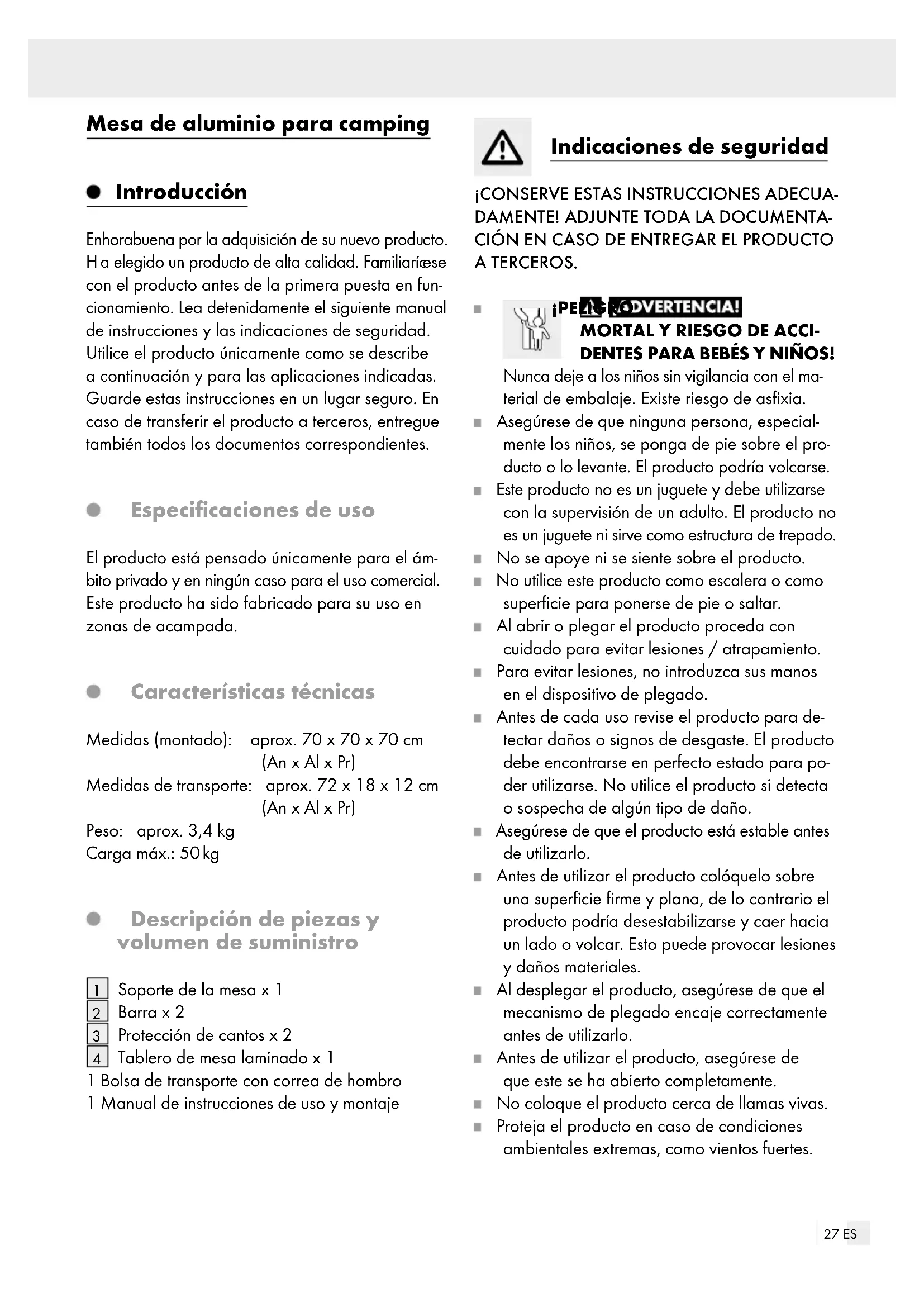 DENTES PARA BEBÉS Y NIÑOS! Nunca deje a los niños sin vigilancia con el ma- terial de embalaje. Existe riesgo de asfixia. Asegúrese de que ninguna persona, especial- mente los niños, se ponga de pie sobre el pro- ducto o lo levante. El producto podría volcarse. Este producto no es un juguete y debe utilizarse con la supervisión de un adulto. El producto no es un juguete ni sirve como estructura de trepado. No se apoye ni se siente sobre el producto. No utilice este producto como escalera o como superficie para ponerse de pie o saltar. Al abrir o plegar el producto proceda con cuidado para evitar lesiones / atrapamiento. Para evitar lesiones, no introduzca sus manos en el dispositivo de plegado. Antes de cada uso revise el producto para de- tectar daños o signos de desgaste. El producto debe encontrarse en perfecto estado para po- der utilizarse. No utilice el producto si detecta o sospecha de algún tipo de daño. Asegúrese de que el producto está estable antes de utilizarlo. Antes de utilizar el producto colóquelo sobre una superficie firme y plana, de lo contrario el producto podría desestabilizarse y caer hacia un lado o volcar. Esto puede provocar lesiones y daños materiales. Al desplegar el producto, asegúrese de que el mecanismo de plegado encaje correctamente antes de utilizarlo. Antes de utilizar el producto, asegúrese de que este se ha abierto completamente. No coloque el producto cerca de llamas vivas. Proteja el producto en caso de condiciones ambientales extremas, como vientos fuertes.28 ES Utilice el producto únicamente para el uso pre- visto y como mueble de exterior en un área de camping. Respete la capacidad de carga máxima (ver «Características técnicas»). Si se supera este límite de carga, podrían provocarse lesiones graves y / o daños materiales. Este producto es fácil y rápido de montar, lo que implica que no es tan estable como una mesa normal. No cargue la mesa con más de 50 kg y evite cargar la mesa por un lado ya que, debido a su poco peso, puede volcarse más rápido que una mesa de exterior normal. No coloque ninguna sombrilla sobre la mesa. Utilice únicamente una sombrilla con su propio soporte. ¡PELIGRO DE DAÑOS MATERIALES! No asumiremos responsabilidad alguna por acci- dentes provocados por el incumplimiento de las indicaciones de seguridad anteriormente descritas o por un manejo inadecuado del producto. Montar el producto Saque el producto de la bolsa de transporte. Tire del soporte de la mesa