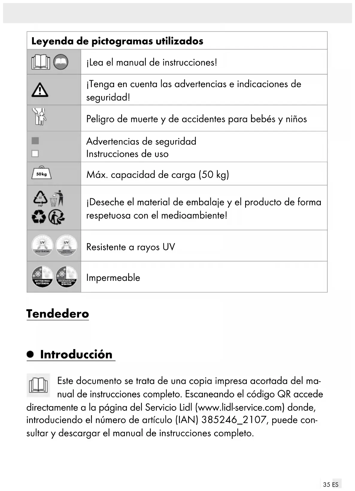 PAP ¡Deseche el material de embalaje y el producto de forma respetuosa con el medioambiente! Resistente a rayos UV Impermeable Tendedero Introducción Este documento se trata de una copia impresa acortada del ma- nual de instrucciones completo. Escaneando el código QR accede directamente a la página del Servicio Lidl (www.lidl-service.com) donde, introduciendo el número de artículo (IAN) 385246_2107, puede con- sultar y descargar el manual de instrucciones completo.36 ES ¡ADVERTENCIA! Observe el manual de instrucciones completo y las indicaciones de seguridad para evitar daños personales y materiales. La guía rápida forma parte integrante del producto. Familiarícese con las in- dicaciones de uso y de seguridad antes de comenzar a utilizar el producto. Conserve esta guía rápida y asegúrese de proporcionar todos los documen- tos relacionados con el producto en caso de entregarlo a terceros. Uso adecuado Este producto es un tendedero de paraguas. Solo para su uso en exterio- res. La modificación del producto no está permitida y provocará daños. Además, como consecuencia podrían producirse lesiones y riesgos mor- tales. El producto ha sido diseñado exclusivamente para uso privado. No ha sido diseñado para un uso comercial. El fabricante no se hace respon- sable de los daños que puedan derivarse del uso indebido. Descripción de los componentes