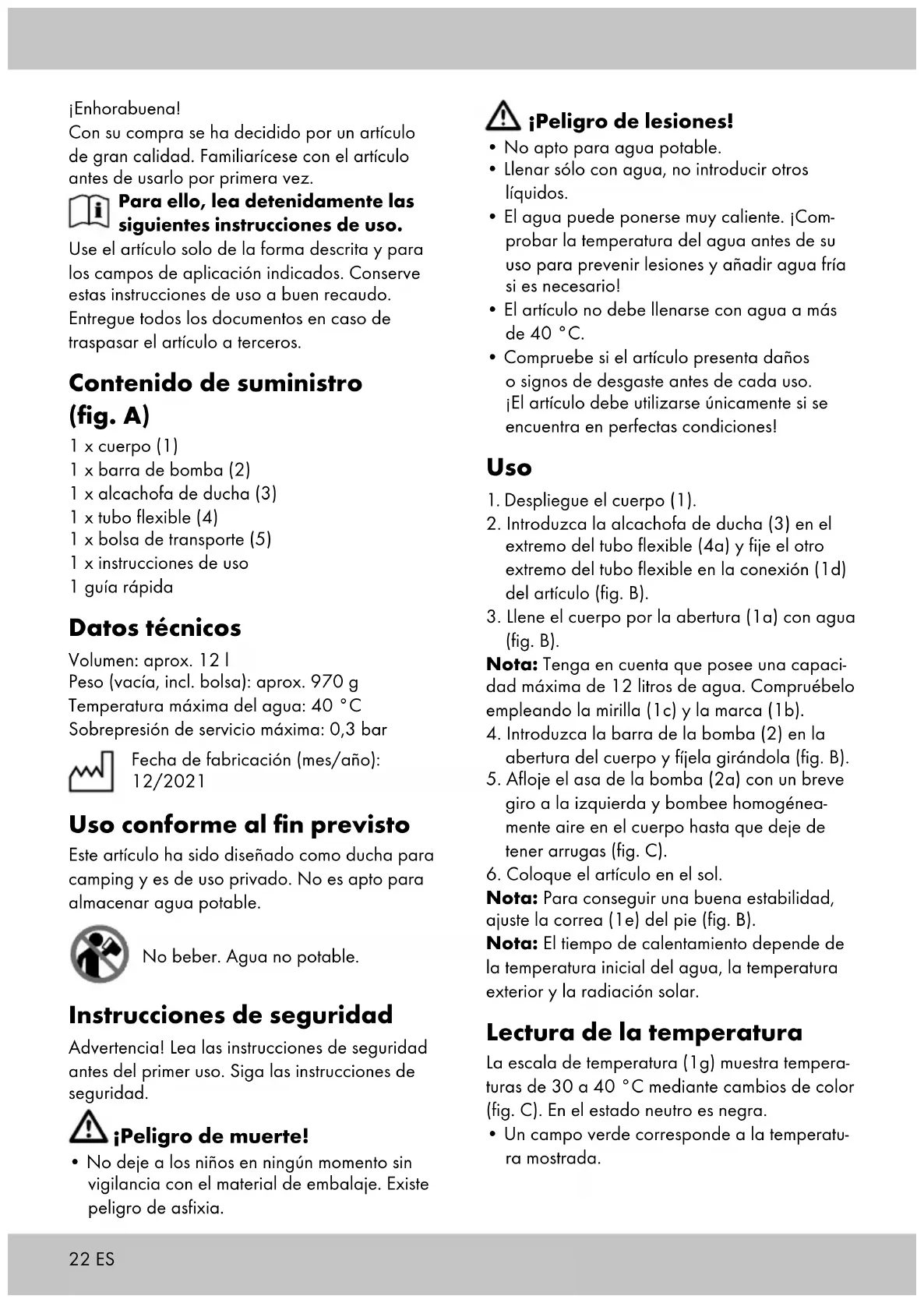 se en la bolsa de transporte (5). Almacenamiento, limpieza Vacíe el agua completamente después de cada uso y deje secar el artículo completamente. Si no va a utilizarlo, almacene siempre el artícu- lo seco y limpio y a temperatura ambiente. Enjuague el artículo con agua o agua jabonosa. ¡IMPORTANTE! No lo limpie con productos de limpieza agresivos. Indicaciones para la eliminación Elimine el artículo y el material de embalaje conforme a la normativa legal local en la ac- tualidad. No deje material de embalaje, como bolsas de plástico, en manos de niños. Guarde el material de embalaje en un lugar inaccesible para éstos. Deseche los productos y embalajes de manera respetuosa con el medio ambiente. El código de reciclaje sirve para identificar diversos materiales para reincorporarlos en el ciclo de reciclaje. El código consta del símbolo de reciclaje, el cual debe reflejar el ciclo de recuperación, y de un número que identifica el material. Indicaciones relativas a la garantía y la gestión de servicios El artículo ha sido fabricado con gran esmero y sometido a controles constantes. Para el mismo, DELTA-SPORT HANDELSKONTOR GmbH ofrece a los clientes finales particulares una garantía de tres años a contar desde la fecha de compra (periodo de garantía) con arreglo a las condiciones que se exponen a continuación. La garantía tiene validez únicamente para fallos del material y fabricación. La garantía no cubre las piezas sometidas a un desgaste normal, las cuales se consideran piezas de desgaste (p. ej., pilas) así como tampoco piezas frágiles como, p. ej., interruptores, baterías o piezas fabricadas en vidrio o cristal. Se excluyen derechos derivados de esta garantía, si se ha realizado un uso incorrecto o abusivo del artículo o que no se encuentre dentro del marco del uso o ámbito de uso previs- tos o si no se ha observado lo recogido en el manual de instrucciones, a no ser que el cliente final demuestre que existen fallos del material o fabricación no derivados de una de las circuns- tancias expuestas anteriormente. Las demandas derivadas de la garantía sólo podrán presentarse dentro del periodo de garantía exhibiendo el comprobante de compra original. Le rogamos, por ello, que conserve el comprobante de compra original. El periodo de garantía no se verá prolongado por ningún tipo de reparación realizada con motivo de la ga- rantía, la garantía legal o como gesto de buena voluntad. Esto se aplica también a las piezas sustituidas o reparadas. Por favor, dirija sus quejas primero a la línea telefónica del servicio de atención al cliente que se indica a continuación o póngase en contacto con nosotros por correo electrónico. Si el caso está cubierto por la garantía, a nuestra elección, repararemos o cambiaremos gratuitamente el artículo o le restituiremos el precio de compra del mismo. De la garantía no se derivan otros derechos. ES24 ES Esta garantía no limitará sus derechos legales, especialmente los derechos de garantía frente al vendedor correspondiente. IAN: 388399_2107 Servicio España Tel.: 900 984 989 E-Mail: deltasport@lidl.es25DK Hjertelig tillykke! Du har valgt at købe et kvalitetsprodukt. Lær produktet at kende, inden du bruger det første gang. Det gør du ved at læse nedenstå- ende brugervejledning omhygge- ligt. Brug kun produktet som beskrevet og til de angivne anvendelsesområder. Opbevar denne brugervejledning et sikkert sted. Udlever også alle dokumenter, hvis produktet videregives til en tredjepart. Leveringsomfang (afb. A) 1 x beholder(1) 1 x pumpestang (2) 1 x brusehoved (3) 1 x slange (4) 1 x bæretaske (5) 1 x brugervejledning 1 x kort vejledning Tekniske data Volumen: ca. 12 l Vægt (ikke fyldt inklusive taske): ca 970 g Maksimal vandtemperatur: 40 °C Maksimalt driftsovertryk: 0,3 bar Fremstillingsdato (måned/år): 12/2021 Tilsigtet brug Denne artikel er udviklet som campingbruser til privat brug. Den er ikke egnet til opbevaring af drikkevand. Må ikke drikkes. Ikke drikkevand. Sikkerhedsoplysninger Advarsel! Læs sikkerhedsoplysningerne før første brug. Følg sikkerhedsoplysningerne. Livsfare!