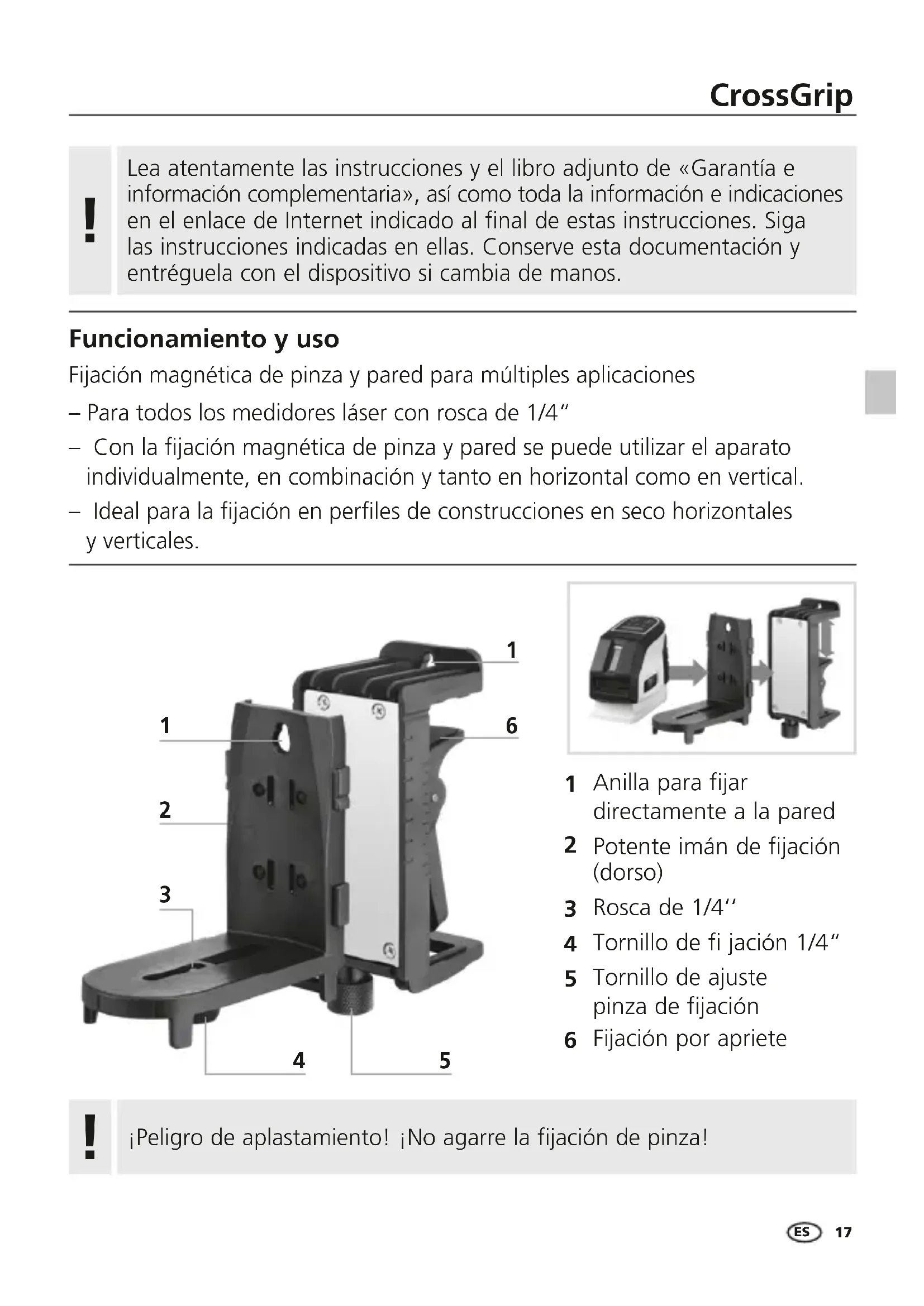 Funcionamiento y uso Fijación magnética de pinza y pared para múltiples aplicaciones – Para todos los medidores láser con rosca de 1/4“ – Con la jación magnética de pinza y pared se puede utilizar el aparato individualmente, en combinación y tanto en horizontal como en vertical. – Ideal para la jación en perles de construcciones en seco horizontales y verticales. Lea atentamente las instrucciones y el libro adjunto de «Garantía e información complementaria», así como toda la información e indicaciones en el enlace de Internet indicado al final de estas instrucciones. Siga las instrucciones indicadas en ellas. Conserve esta documentación y entréguela con el dispositivo si cambia de manos.