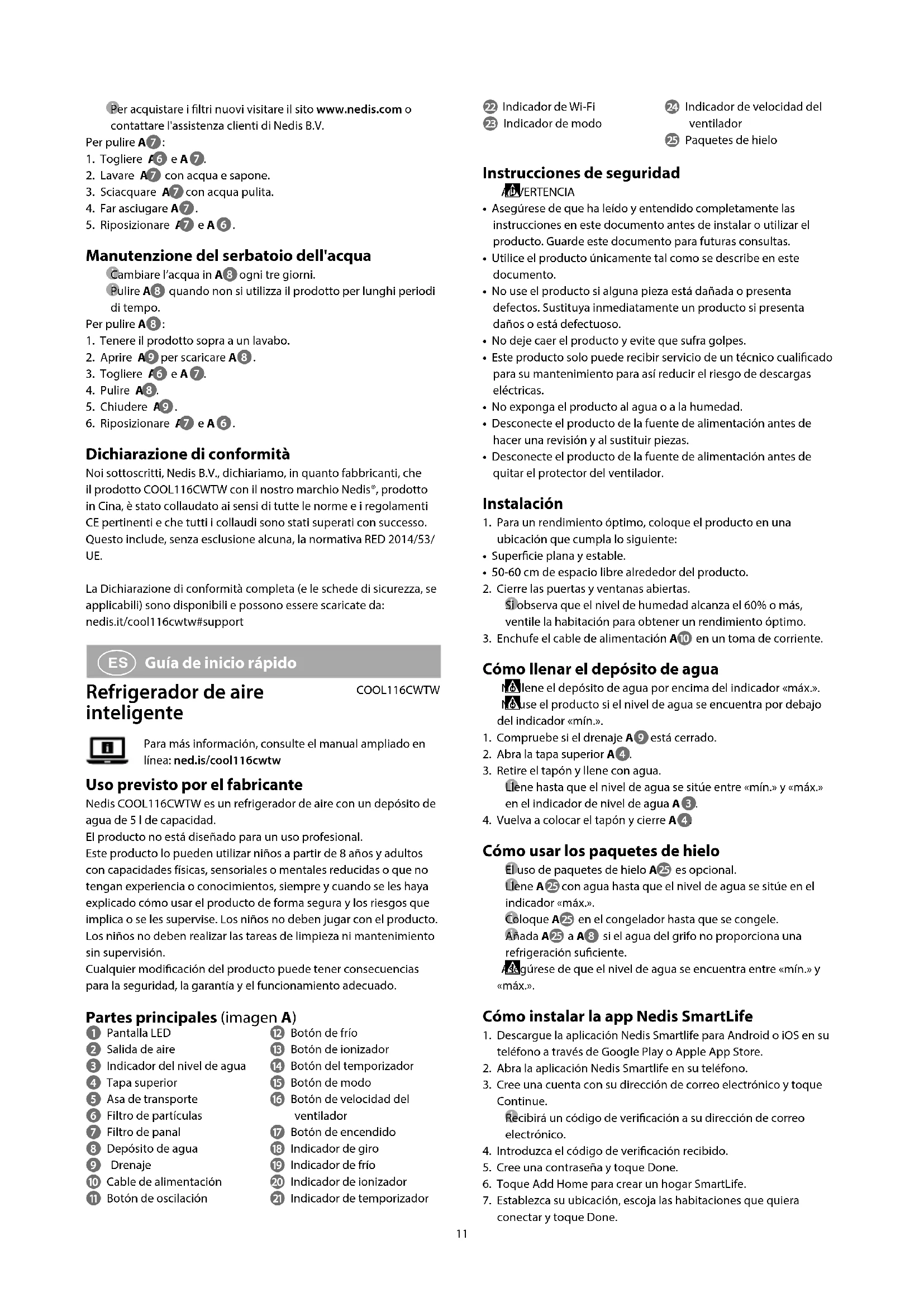 Guía de inicio rápido Refrigerador de aire inteligente COOL116CWTWPara más información, consulte el manual ampliado en línea: ned.is/cool116cwtw Uso previsto por el fabricante Nedis COOL116CWTW es un refrigerador de aire con un depósito de agua de 5 l de capacidad.El producto no está diseñado para un uso profesional.Este producto lo pueden utilizar niños a partir de 8 años y adultos con capacidades físicas, sensoriales o mentales reducidas o que no tengan experiencia o conocimientos, siempre y cuando se les haya explicado cómo usar el producto de forma segura y los riesgos que implica o se les supervise. Los niños no deben jugar con el producto. Los niños no deben realizar las tareas de limpieza ni mantenimiento sin supervisión.Cualquier modicación del producto puede tener consecuencias para la seguridad, la garantía y el funcionamiento adecuado. Partes principales (imagen A) 1 Pantalla LED2 Salida de aire3 Indicador del nivel de agua4 Tapa superior5 Asa de transporte6 Filtro de partículas7 Filtro de panal8 Depósito de agua9 Drenajeq Cable de alimentaciónw Botón de oscilacióne Botón de fríor Botón de ionizadort Botón del temporizadory Botón de modou Botón de velocidad del ventiladori Botón de encendidoo Indicador de girop Indicador de fríoa Indicador de ionizadors Indicador de temporizador12 Para limpiar A