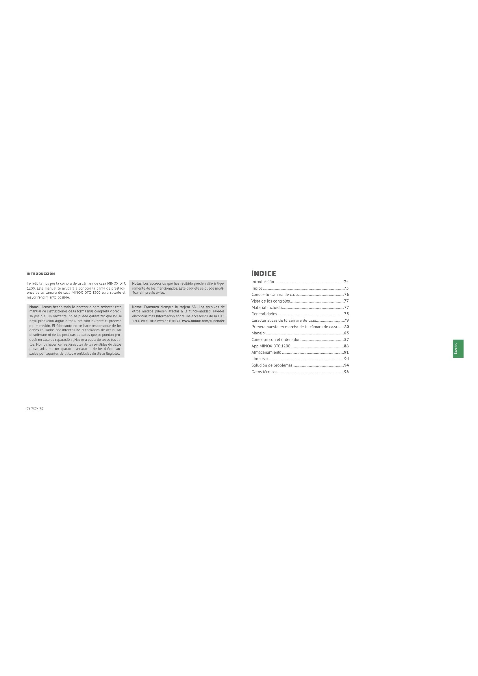 - Durée de veille env. 6 mois (avec 12 batteries AA) Dimensions ca. 140 mm (H) x 95 mm (La) x 57 mm (P) Éclairage 60 LEDs infrarouge Température recommandée pour la conservation entre -20° et +60° Celsius Température recommandée pour l’utilisation entre -20° et +60° Celsius Poids de la caméra de surveillance 400 g (sans batteries) Angle de saisie 4Capteur de mouvement: 40°74 7574 75 Español INTRODUCCIÓN Te felicitamos por la compra de tu cámara de caza MINOX DTC 1200. Este manual te ayudará a conocer la gama de prestaci- ones de tu cámara de caza MINOX DTC 1200 para sacarle el mayor rendimiento posible. Notas: Hemos hecho todo lo necesario para redactar este manual de instrucciones de la forma más completa y preci- sa posible. No obstante, no se puede garantizar que no se haya producido algún error u omisión durante el proceso de impresión. El fabricante no se hace responsable de los daños causados por intentos no autorizados de actualizar el software ni de las pérdidas de datos que se puedan pro- ducir en caso de reparación. ¡Haz una copia de todos tus da- tos! No nos hacemos responsables de las pérdidas de datos provocadas por un aparato averiado ni de los daños cau- sados por soportes de datos o unidades de disco ilegibles. Notas: Los accesorios que has recibido pueden diferir lige- ramente de los mencionados. Este paquete se puede modi- ficar sin previo aviso. Notas: Formatea siempre la tarjeta SD. Los archivos de otros medios pueden afectar a la funcionalidad. Puedes encontrar más información sobre los accesorios de la DTC 1200 en el sitio web de MINOX: www.minox.com/zubehoer ÍNDICE Introducción p. 74