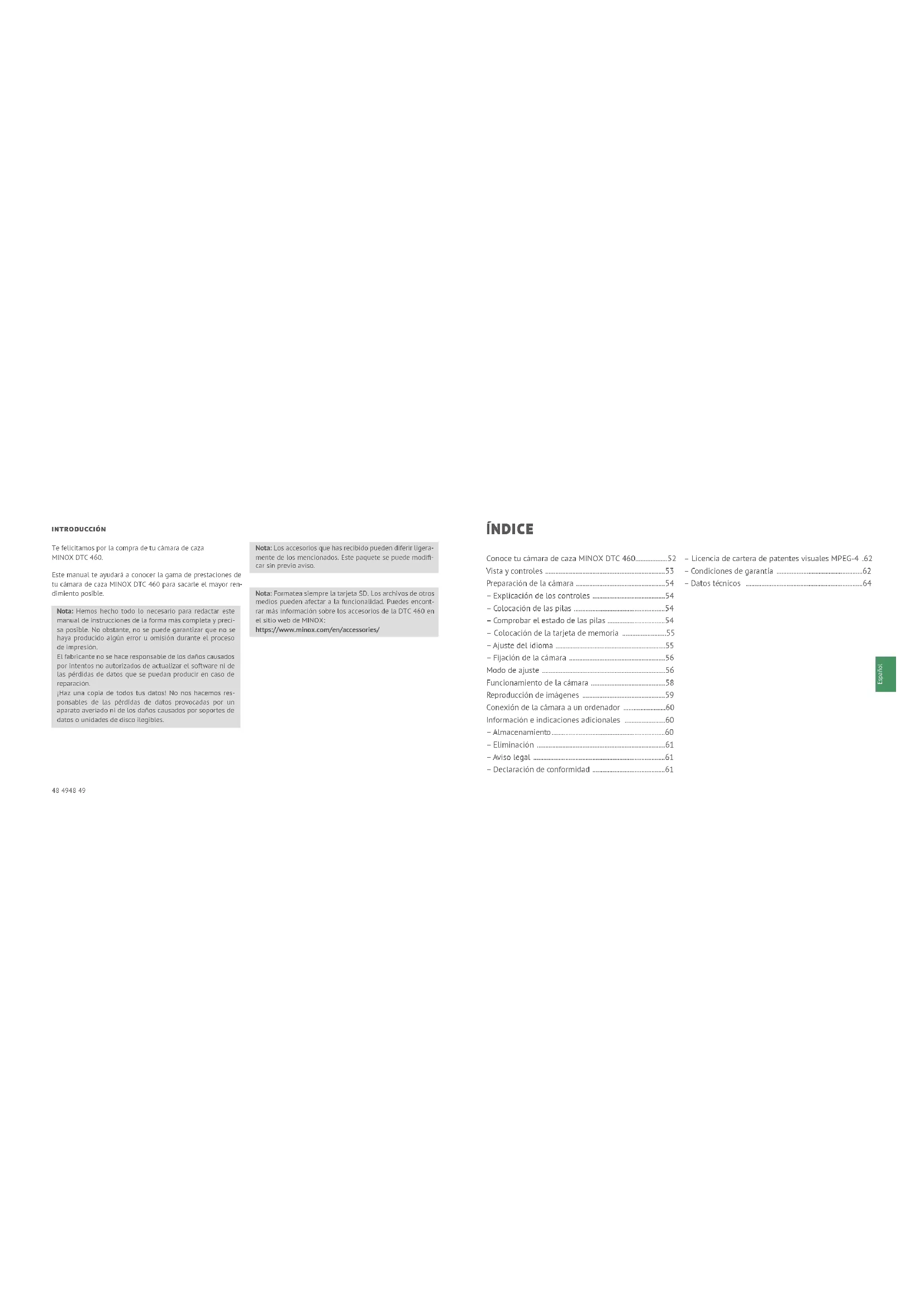 - – Datos técnicos INTRODUCCIÓN Te felicitamos por la compra de tu cámara de caza MINOX DTC 460. Este manual te ayudará a conocer la gama de prestaciones de tu cámara de caza MINOX DTC 460 para sacarle el mayor ren- dimiento posible. Nota: Hemos hecho todo lo necesario para redactar este manual de instrucciones de la forma más completa y preci- sa posible. No obstante, no se puede garantizar que no se haya producido algún error u omisión durante el proceso de impresión. El fabricante no se hace responsable de los daños causados por intentos no autorizados de actualizar el software ni de las pérdidas de datos que se puedan producir en caso de reparación. ¡Haz una copia de todos tus datos! No nos hacemos res- ponsables de las pérdidas de datos provocadas por un aparato averiado ni de los daños causados por soportes de datos o unidades de disco ilegibles. Nota: Los accesorios que has recibido pueden diferir ligera- mente de los mencionados. Este paquete se puede modifi- car sin previo aviso. Nota: Formatea siempre la tarjeta SD. Los archivos de otros medios pueden afectar a la funcionalidad. Puedes encont- rar más información sobre los accesorios de la DTC 460 en el sitio web de MINOX: https://www.minox.com/en/accessories/50 5150 51 Español p. 64