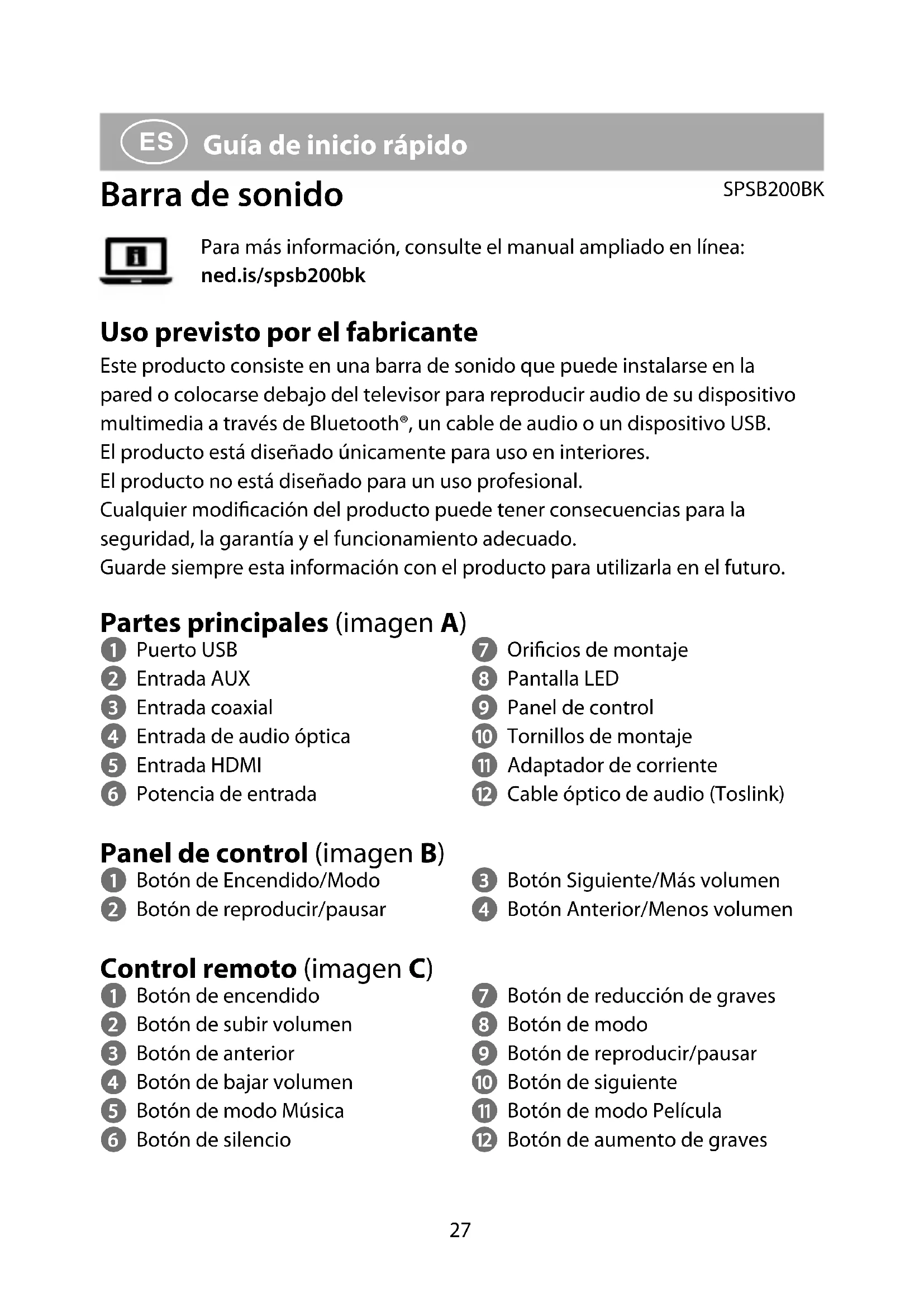 Guía de inicio rápido Barra de sonido SPSB200BK Para más información, consulte el manual ampliado en línea: ned.is/spsb200bk Uso previsto por el fabricante Este producto consiste en una barra de sonido que puede instalarse en la pared o colocarse debajo del televisor para reproducir audio de su dispositivo multimedia a través de Bluetooth®, un cable de audio o un dispositivo USB. El producto está diseñado únicamente para uso en interiores. El producto no está diseñado para un uso profesional. Cualquier modicación del producto puede tener consecuencias para la seguridad, la garantía y el funcionamiento adecuado. Guarde siempre esta información con el producto para utilizarla en el futuro. Partes principales (imagen A) 1 Puerto USB 2 Entrada AUX 3 Entrada coaxial 4 Entrada de audio óptica 5 Entrada HDMI 6 Potencia de entrada 7 Oricios de montaje 8 Pantalla LED 9 Panel de control q Tornillos de montaje w Adaptador de corriente e Cable óptico de audio (Toslink) Panel de control (imagen B) 1 Botón de Encendido/Modo 2 Botón de reproducir/pausar 3 Botón Siguiente/Más volumen 4 Botón Anterior/Menos volumen Control remoto (imagen C) 1 Botón de encendido 2 Botón de subir volumen 3 Botón de anterior 4 Botón de bajar volumen 5 Botón de modo Música 6 Botón de silencio 7 Botón de reducción de graves 8 Botón de modo 9 Botón de reproducir/pausar q Botón de siguiente w Botón de modo Película e Botón de aumento de graves28 Instrucciones de seguridad