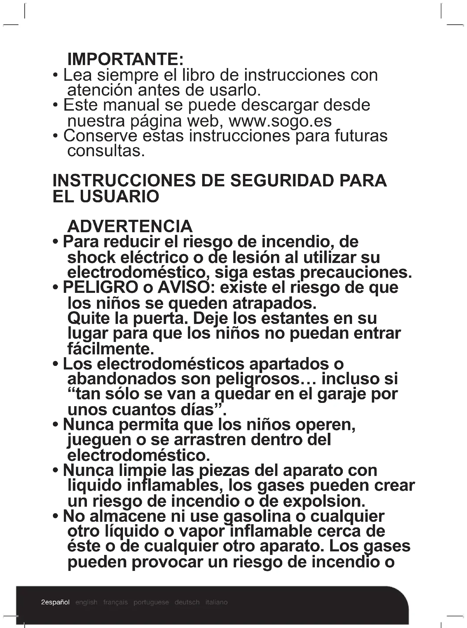 - No almacene ni use gasolina o cualquier otro líquido o vapor inamable cerca de éste o de cualquier otro aparato. Los gases pueden provocar un riesgo de incendio o3español english français portuguese deutsch italiano de explosión.