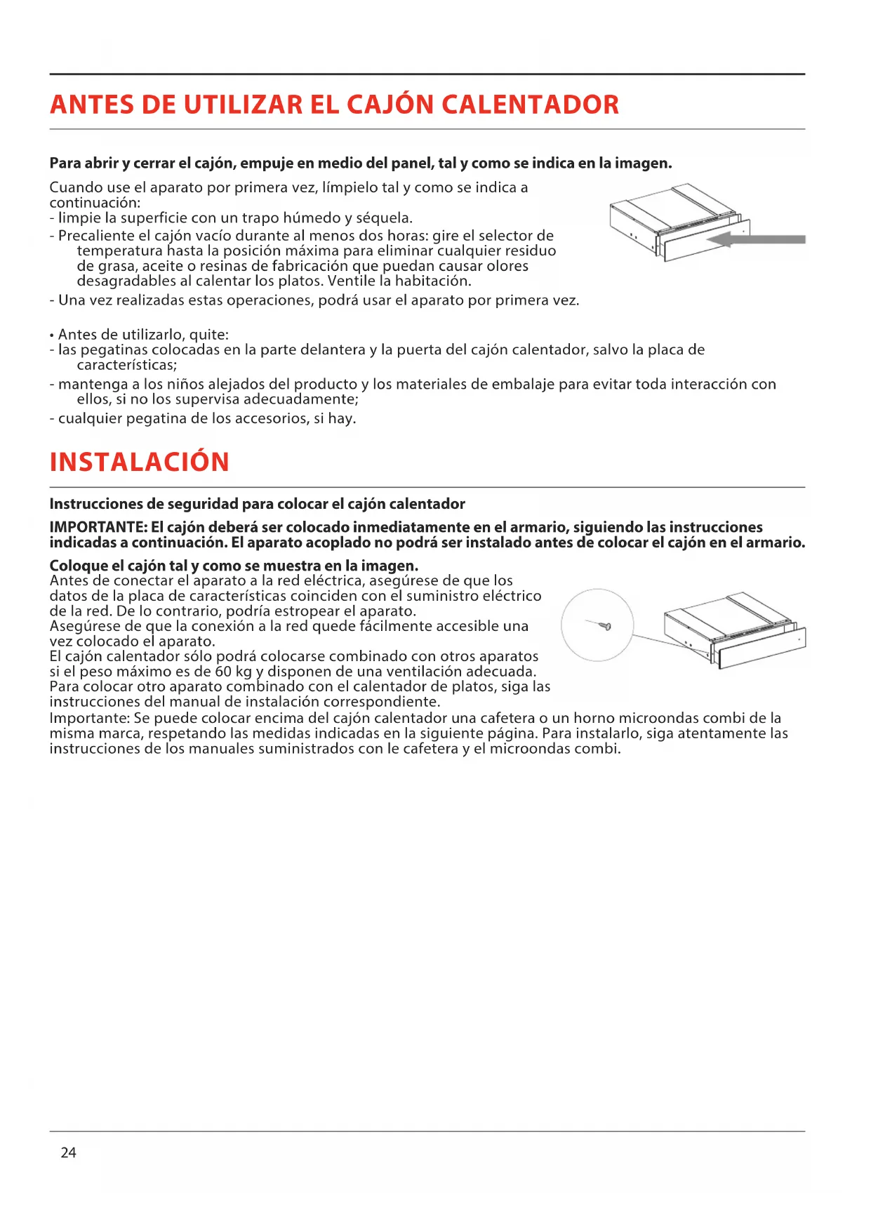 - Antes de utilizarlo, quite: - las pegatinas colocadas en la parte delantera y la puerta del cajón calentador, salvo la placa de características; - mantenga a los niños alejados del producto y los materiales de embalaje para evitar toda interacción con ellos, si no los supervisa adecuadamente; - cualquier pegatina de los accesorios, si hay. INSTALACIÓN Instrucciones de seguridad para colocar el cajón calentador IMPORTANTE: El cajón deberá ser colocado inmediatamente en el armario, siguiendo las instrucciones indicadas a continuación. El aparato acoplado no podrá ser instalado antes de colocar el cajón en el armario. Coloque el cajón tal y como se muestra en la imagen. Antes de conectar el aparato a la red eléctrica, asegúrese de que los datos de la placa de características coinciden con el suministro eléctrico de la red. De lo contrario, podría estropear el aparato. Asegúrese de que la conexión a la red quede fácilmente accesible una vez colocado el aparato. El cajón calentador sólo podrá colocarse combinado con otros aparatos si el peso máximo es de 60 kg y disponen de una ventilación adecuada. Para colocar otro aparato combinado con el calentador de platos, siga las instrucciones del manual de instalación correspondiente. Importante: Se puede colocar encima del cajón calentador una cafetera o un horno microondas combi de la misma marca, respetando las medidas indicadas en la siguiente página. Para instalarlo, siga atentamente las instrucciones de los manuales suministrados con le cafetera y el microondas combi.ES