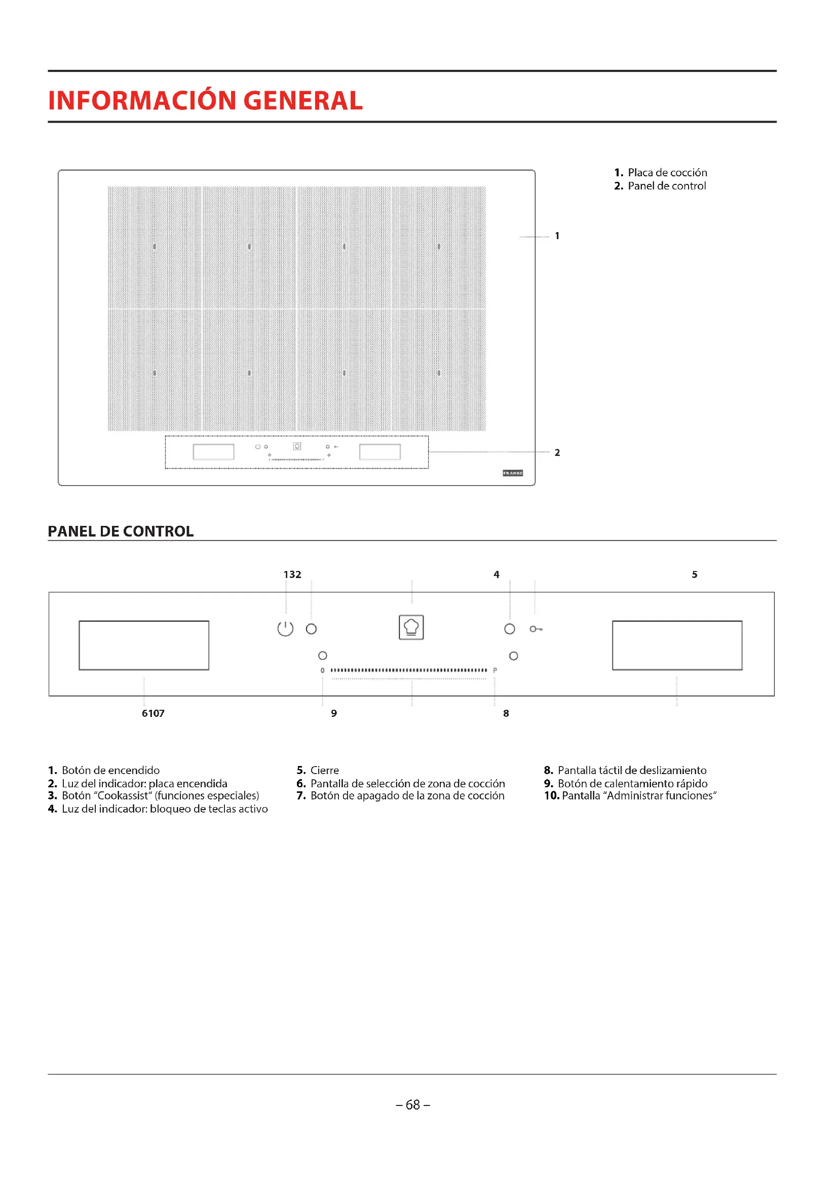 – 63 –Antes de usar el aparato, lea atentamente estas instrucciones de seguridad. Téngalas a mano para consultarlas más adelante. Este manual y el propio aparato contienen advertencias de seguridad que se deben leer y seguir en todo momento. El fabricante declina cualquier responsabilidad derivada del incumplimiento de estas instrucciones de seguridad, del uso indebido del aparato o del ajuste incorrecto de los mandos. ADVERTENCIA: Si la supercie está rota, apague el aparato para evitar una posible descarga eléctrica. ADVERTENCIA: Peligro de incendio: no deje ningún objeto sobre las supercies de cocción. PRECAUCIÓN: El proceso de cocción tiene que ser supervisado. Un proceso de cocción corto tiene que ser supervisado continuamente. ADVERTENCIA: Cocinar con grasa o aceite en una placa sin vigilancia puede resultar peligroso, hay riesgo de incendio. No intente NUNCA apagar un incendio con agua: en lugar de ello, apague el aparato y luego cubra las llamas con una tapa o una manta ignífuga p. ej. No utilice la placa como supercie de trabajo o apoyo. Mantenga los paños y otros materiales inamables alejados del aparato hasta que todos los componentes se hayan enfriado por completo; hay riesgo de incendio. No se deben colocar en la supercie de la placa objetos metálicos como cuchillos, tenedores, cucharas y tapas, ya que pueden calentarse. Los niños muy pequeños (0-3 años) deben mantenerse alejados del aparato. Los niños pequeños (3-8 años) deben mantenerse alejados del aparato, a menos que estén bajo vigilancia constante. Tanto los niños a partir de 8 años como las personas cuyas capacidades físicas, sensoriales o mentales estén disminuidas o que carezcan de la experiencia y conocimientos necesarios pueden utilizar este aparato si reciben la supervisión o las instrucciones necesarias para utilizarlo de forma segura y comprenden los riesgos a los que se exponen. Los niños no deberán jugar con el aparato. Los niños no deben encargarse de la limpieza y el mantenimiento, a menos que estén supervisados. Después de usarla, apague la placa con el mando correspondiente y no confíe en el detector de recipientes. ADVERTENCIA: El aparato y las partes accesibles se calientan durante el uso. Es necesario prestar atención para no tocar los elementos calefactores. Mantenga alejados a los niños menores 8 años salvo que sean supervisados continuamente. USO PERMITIDO PRECAUCIÓN: El aparato no está diseñado para su uso con un temporizador externo o un sistema de mando a distancia. Este aparato está destinado a un uso en ambientes domésticos o en ambientes similares como: áreas de cocina en ocinas, tiendas y otros entornos laborales; granjas; por los clientes de hoteles, moteles y otros entornos residenciales. No se admite ningún otro uso (p. ej., calentar habitaciones). Este aparato no es para uso profesional. No utilice este aparato al aire libre. INSTALACIÓN La manipulación e instalación del aparato la deben realizar dos o más personas; hay riesgo de lesionarse. Utilice guantes de protección para desembalar e instalar el aparato; hay riesgo de cortarse. La instalación, incluido el suministro de agua (si lo hay), las conexiones eléctricas y las reparaciones deben ser efectuadas por un técnico cualicado. No realice reparaciones ni sustituciones de partes del aparato no indicadas especícamente en el manual del usuario. Impida que los niños se acerquen a la zona de la instalación. Tras desembalar el aparato, compruebe que no haya sufrido daños durante el transporte. Si observa algún problema, póngase en contacto con el distribuidor o el Servicio Postventa más cercano. Una vez instalado, los residuos del embalaje (plástico, porexpan, etc.) se deben guardar fuera del alcance de los niños; hay riesgo de asxia. El aparato debe desconectarse del suministro eléctrico antes de efectuar cualquier operación de instalación; hay riesgo de descarga eléctrica. Durante la instalación, compruebe que el aparato no dañe el cable de alimentación; hay riesgo de descarga eléctrica. No ponga en marcha el aparato hasta que no haya terminado el proceso de instalación. Realice todas las operaciones de corte de armarios antes de encastar el aparato y limpie todas las astillas y el serrín. Si el aparato no está instalado encima de un horno, debe instalarse un panel separador (no incluido) en el compartimento debajo del aparato.
