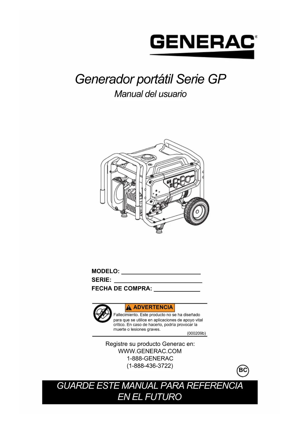 www.P65Warnings.ca.gov.Manual del usuario del generador portátil 1 Sección 1 Introducción y seguridad Introducción Lea este manual cuidadosamente Si no comprende alguna sección de este manual, llame a su IASD (Independent Authorized Service Dealer, concesionario independiente de servicio autorizado) más cercano o al Servicio al Cliente de Generac al 1-888-436-3722 (1-888-GENERAC), o visite www.generac.com para conocer los procedimientos de arranque, operación y mantenimiento. El propietario es responsable del mantenimiento adecuado y uso seguro de la unidad. GUARDE ESTAS INSTRUCCIONES para referencia futura. Este manual contiene instrucciones importantes que se deben seguir durante la instalación, operación y mantenimiento de la unidad y sus componentes. Siempre entregue este manual a cualquier persona que vaya a usar esta unidad, y enséñele cómo arrancar, operar y detener correctamente la unidad en caso de emergencia. La información que aparece en este manual es precisa y está basada en productos fabricados en el momento en el que se editó esta publicación. El fabricante se reserva el derecho de hacer las actualizaciones técnicas, las correcciones y las revisiones de los productos que considere necesarias sin previo aviso. Normas de seguridad El fabricante no puede prever todas las posibles circunstancias que pueden suponer un peligro. Las alertas que aparecen en este manual, y en las etiquetas y los adhesivos pegados en la unidad no incluyen todos los peligros. Si se utiliza un procedimiento, método de trabajo o técnica de funcionamiento no recomendados específicamente por el fabricante, compruebe que sean seguros para otros usuarios y que no pongan en peligro el equipo. En esta publicación y en las etiquetas y adhesivos pegados en la unidad, los bloques PELIGRO, ADVERTENCIA, PRECAUCIÓN y NOTA se utilizan para alertar al personal sobre instrucciones especiales relacionadas con un funcionamiento que puede ser peligroso si se realiza de manera incorrecta o imprudente. Léalos atentamente y respete sus instrucciones. Las definiciones de alertas son las siguientes: NOTA: Las notas incluyen información adicional importante para un procedimiento y se incluyen en el texto normal de este manual. Estos avisos de seguridad no pueden eliminar los peligros que indican. Para evitar accidentes, es importante el sentido común y el seguimiento estricto de las instrucciones especiales cuando se realice la acción o la operación de mantenimiento. Símbolos de seguridad y significado (000100a) ADVERTENCIA Consulte el manual. Lea y comprenda completamente el manual antes de usar el producto. No comprender completamente el manual puede provocar la muerte o lesiones graves. (000001) PELIGRO Indica una situación peligrosa que, si no se evita, ocasionará la muerte o lesiones graves. (000002) ADVERTENCIA Indica una situación peligrosa que, si no se evita, podría ocasionar la muerte o lesiones graves. (000003) PRECAUCIÓN Indica una situación riesgosa que, si no se evita, puede producir lesiones leves o moderadads. ¡PELIGRO! Usar un generador en interiores LO PUEDE MATAR EN MINUTOS. Los gases de escape del generador contienen monóxido de carbono. Este es un veneno que no se puede ver u oler. NUNCA lo use dentro de una casa o garaje, AUNQUE si la puerta y las ventanas se encuentran abiertas. Use únicamente en EXTERIORES, y alejado de ventanas, puertas y ventilaciones.