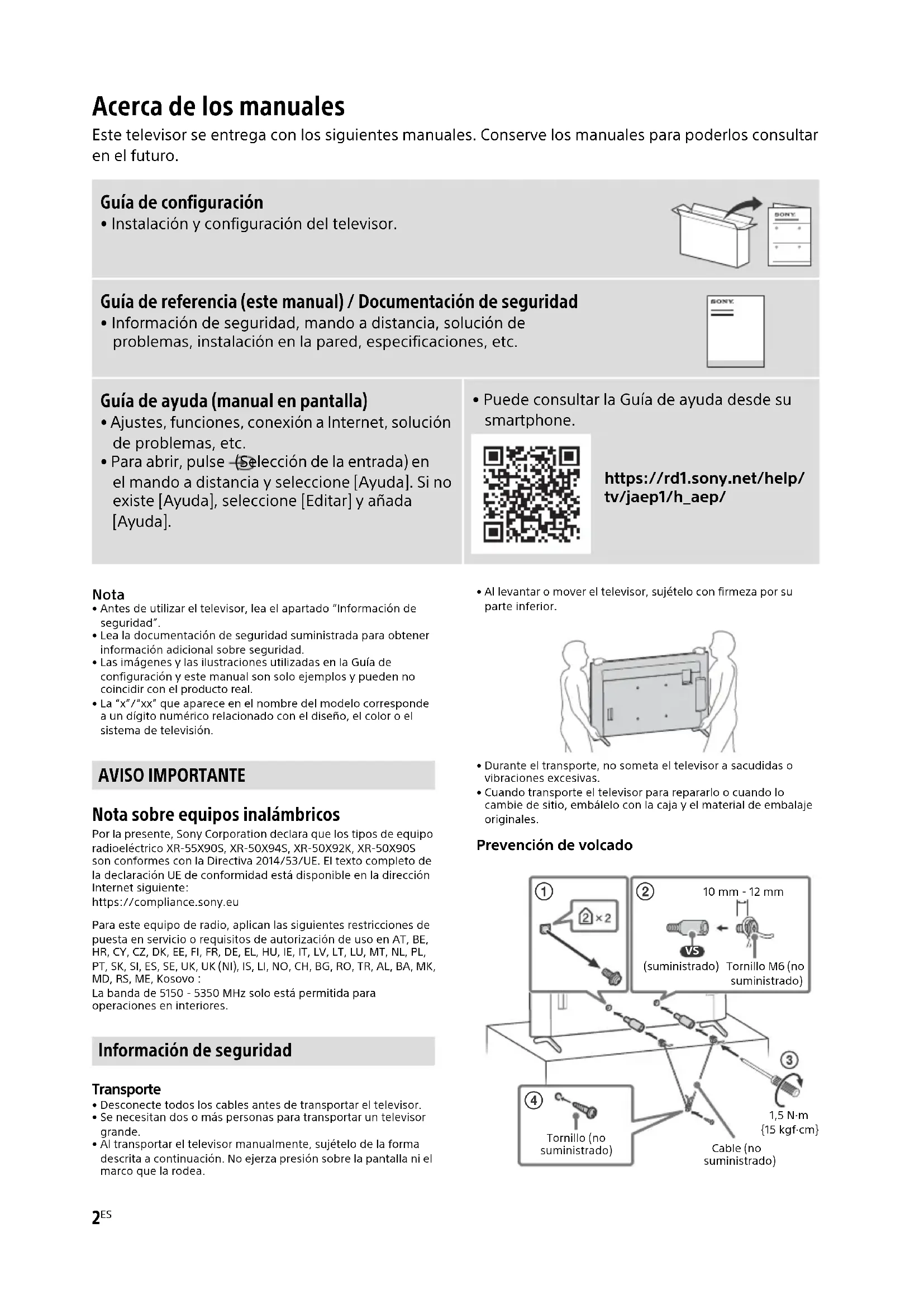 - Antes de utilizar el televisor, lea el apartado “Información de seguridad”.• Lea la documentación de seguridad suministrada para obtener información adicional sobre seguridad.• Las imágenes y las ilustraciones utilizadas en la Guía de configuración y este manual son solo ejemplos y pueden no coincidir con el producto real.• La “x”/“xx” que aparece en el nombre del modelo corresponde a un dígito numérico relacionado con el diseño, el color o el sistema de televisión. Nota sobre equipos inalámbricos Por la presente, Sony Corporation declara que los tipos de equipo radioeléctrico XR-55X90S, XR-50X94S, XR-50X92K, XR-50X90S son conformes con la Directiva 2014/53/UE. El texto completo de la declaración UE de conformidad está disponible en la dirección Internet siguiente: https://compliance.sony.euPara este equipo de radio, aplican las siguientes restricciones de puesta en servicio o requisitos de autorización de uso en AT, BE, HR, CY, CZ, DK, EE, FI, FR, DE, EL, HU, IE, IT, LV, LT, LU, MT, NL, PL, PT, SK, SI, ES, SE, UK, UK (NI), IS, LI, NO, CH, BG, RO, TR, AL, BA, MK, MD, RS, ME, Kosovo :La banda de 5150 - 5350 MHz solo está permitida para operaciones en interiores. Transporte