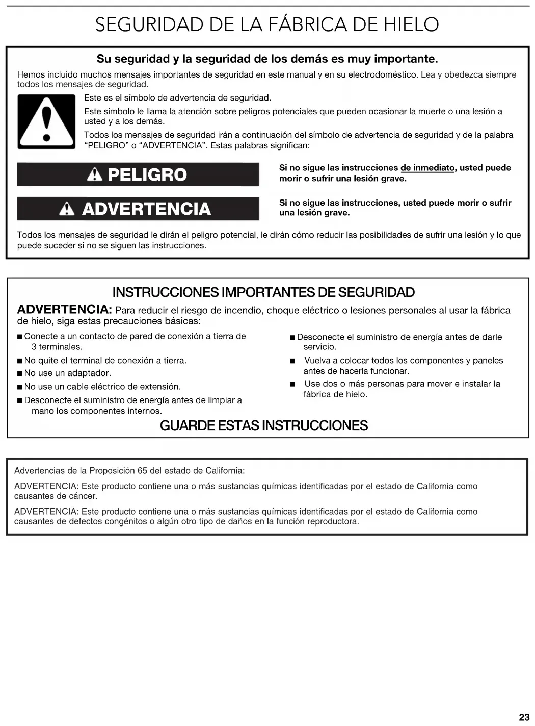 ■ Conecte a un contacto de pared de conexión a tierra de 3 terminales. ■ No quite el terminal de conexión a tierra.■ No use un adaptador.■ No use un cable eléctrico de extensión. ■ Desconecte el suministro de energía antes de limpiar a mano los componentes internos. ■ Desconecte el suministro de energía antes de darle servicio. ■ Vuelva a colocar todos los componentes y paneles antes de hacerla funcionar. ■ Use dos o más personas para mover e instalar la fábrica de hielo. Advertencias de la Proposición 65 del estado de California:ADVERTENCIA: Este producto contiene una o más sustancias químicas identificadas por el estado de California como causantes de cáncer.ADVERTENCIA: Este producto contiene una o más sustancias químicas identificadas por el estado de California como causantes de defectos congénitos o algún otro tipo de daños en la función reproductora.24
