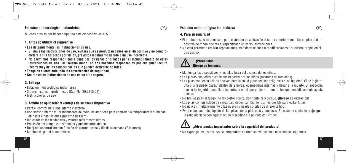 La recepción de la señal DCF se lleva a cabo todos los días entre las 02:00 hasta 05:00 de la mañana en su lugar. Si la recepción del reloj a las 5.00 no tiene éxito, se llevará a cabo hasta la 2.00 de la mañana. TFA_No. 35.1142_Anleit_02_23 01.02.2023 16:56 Uhr Seite 479594 Estación meteorológica inalámbrica