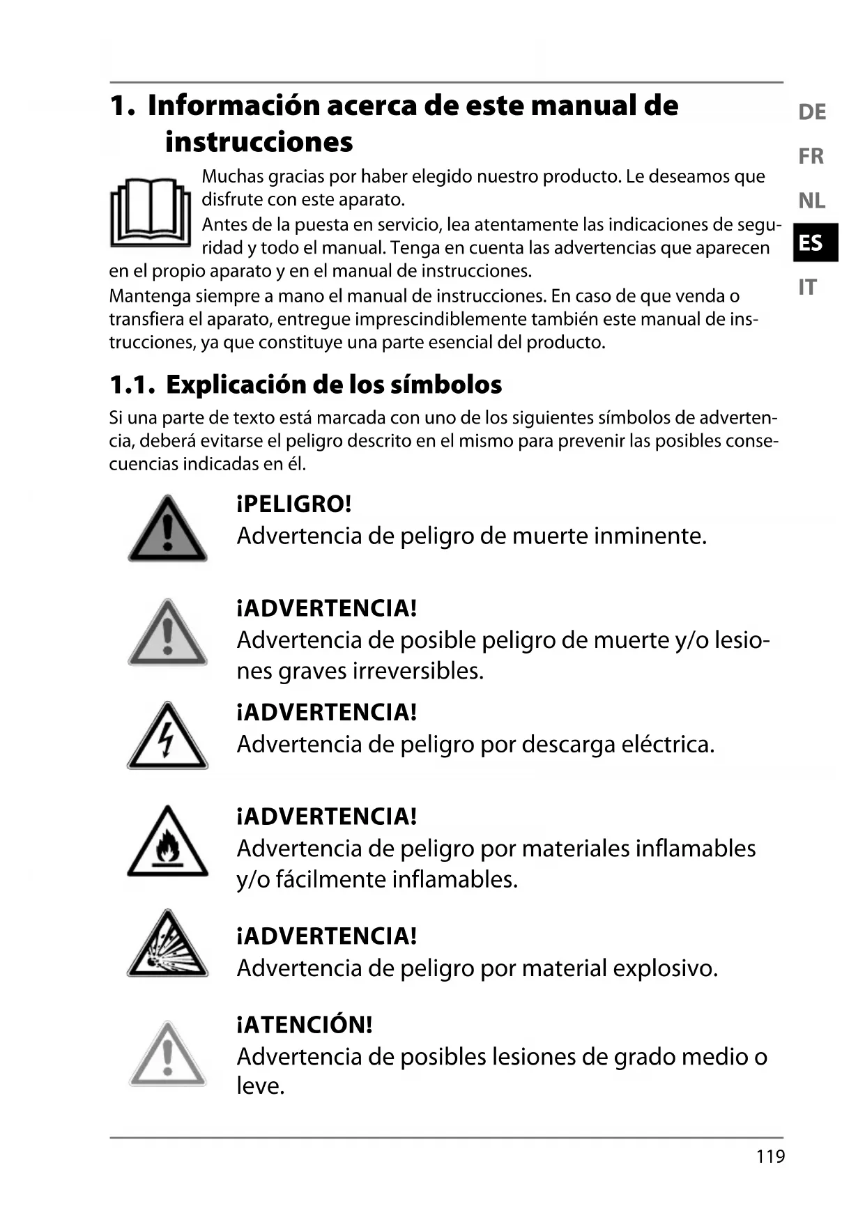 instrucciones Muchas gracias por haber elegido nuestro producto. Le deseamos que disfrute con este aparato. Antes de la puesta en servicio, lea atentamente las indicaciones de segu- ridad y todo el manual. Tenga en cuenta las advertencias que aparecen en el propio aparato y en el manual de instrucciones. Mantenga siempre a mano el manual de instrucciones. En caso de que venda o transfiera el aparato, entregue imprescindiblemente también este manual de ins- trucciones, ya que constituye una parte esencial del producto. 1.1. Explicación de los símbolos Si una parte de texto está marcada con uno de los siguientes símbolos de adverten- cia, deberá evitarse el peligro descrito en el mismo para prevenir las posibles conse- cuencias indicadas en él. PELIGRO! Advertencia de peligro de muerte inminente. ADVERTENCIA! Advertencia de posible peligro de muerte y/o lesio- nes graves irreversibles. ADVERTENCIA! Advertencia de peligro por descarga eléctrica. ADVERTENCIA! Advertencia de peligro por materiales inflamables y/o fácilmente inflamables. ADVERTENCIA! Advertencia de peligro por material explosivo. ATENCIÓN! Advertencia de posibles lesiones de grado medio o leve. 37339 ML-DS MSN 50067448 Content Final REV3.indb 11937339 ML-DS MSN 50067448 Content Final REV3.indb 119 08.03.2021 09:42:1508.03.2021 09:42:15120 AVISO! Respete las indicaciones para evitar daños materia- les. AVISO! Información más detallada para el uso del aparato. Respete las indicaciones del manual de instrucciones. Muestra la posición vertical correcta del embalaje de transporte.