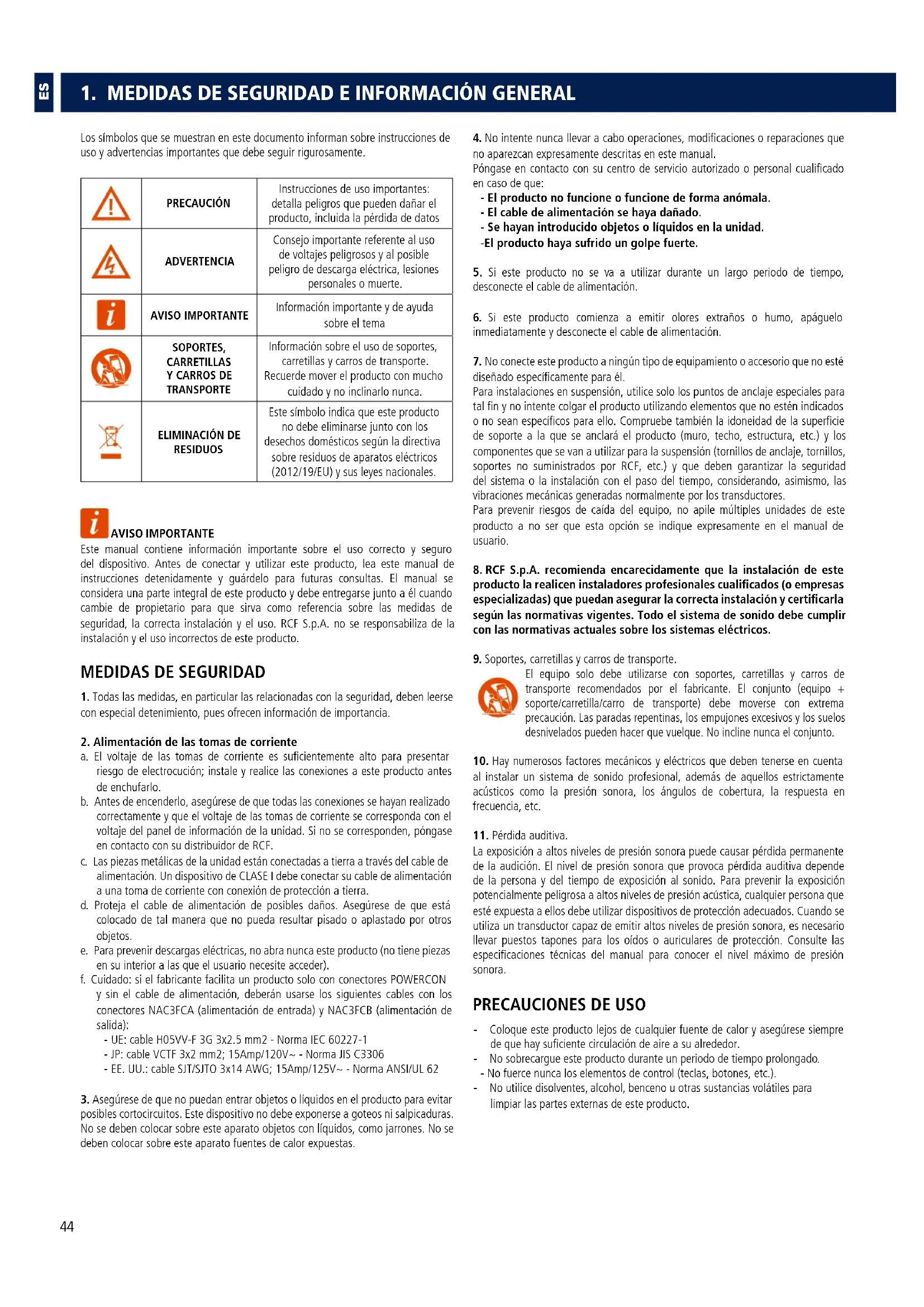 a. El voltaje de las tomas de corriente es suficientemente alto para presentar riesgo de electrocución; instale y realice las conexiones a este producto antes de enchufarlo. b. Antes de encenderlo, asegúrese de que todas las conexiones se hayan realizado correctamente y que el voltaje de las tomas de corriente se corresponda con el voltaje del panel de información de la unidad. Si no se corresponden, póngase en contacto con su distribuidor de RCF. c. Las piezas metálicas de la unidad están conectadas a tierra a través del cable de alimentación. Un dispositivo de CLASE I debe conectar su cable de alimentación a una toma de corriente con conexión de protección a tierra. d. Proteja el cable de alimentación de posibles daños. Asegúrese de que está colocado de tal manera que no pueda resultar pisado o aplastado por otros objetos. e. Para prevenir descargas eléctricas, no abra nunca este producto (no tiene piezas en su interior a las que el usuario necesite acceder). f. Cuidado: si el fabricante facilita un producto solo con conectores POWERCON y sin el cable de alimentación, deberán usarse los siguientes cables con los conectores NAC3FCA (alimentación de entrada) y NAC3FCB (alimentación de salida): - UE: cable H05VV-F 3G 3x2.5 mm2 - Norma IEC 60227-1 - JP: cable VCTF 3x2 mm2; 15Amp/120V~ - Norma JIS C3306 - EE.UU.: cable SJT/SJTO 3x14 AWG; 15Amp/125V~ - Norma ANSI/UL 62