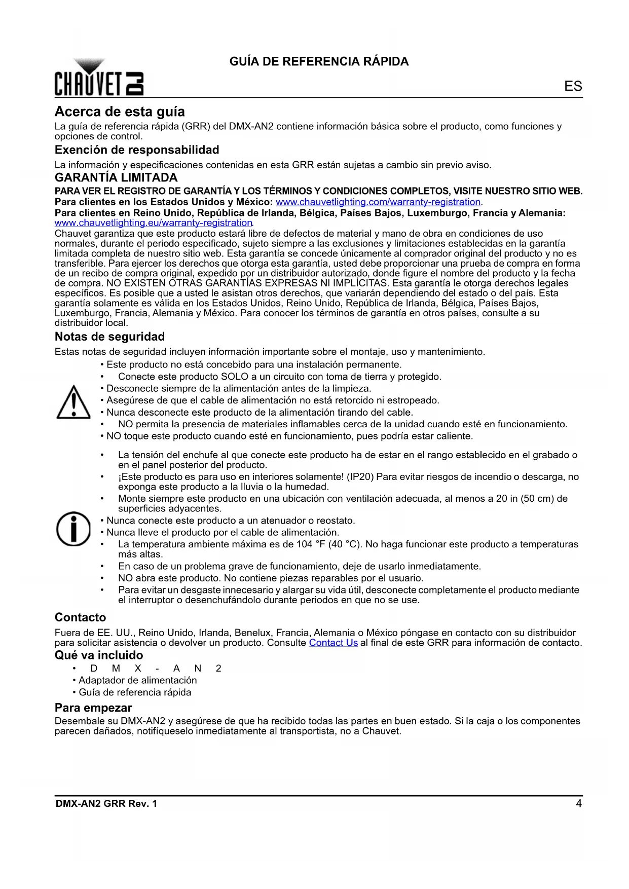 Chauvet garantiza que este producto estará libre de defectos de material y mano de obra en condiciones de uso normales, durante el periodo especificado, sujeto siempre a las exclusiones y limitaciones establecidas en la garantía limitada completa de nuestro sitio web. Esta garantía se concede únicamente al comprador original del producto y no es transferible. Para ejercer los derechos que otorga esta garantía, usted debe proporcionar una prueba de compra en forma de un recibo de compra original, expedido por un distribuidor autorizado, donde figure el nombre del producto y la fecha de compra. NO EXISTEN OTRAS GARANTÍAS EXPRESAS NI IMPLÍCITAS. Esta garantía le otorga derechos legales específicos. Es posible que a usted le asistan otros derechos, que variarán dependiendo del estado o del país. Esta garantía solamente es válida en los Estados Unidos, Reino Unido, República de Irlanda, Bélgica, Países Bajos, Luxemburgo, Francia, Alemania y México. Para conocer los términos de garantía en otros países, consulte a su distribuidor local. Notas de seguridad Estas notas de seguridad incluyen información importante sobre el montaje, uso y mantenimiento. Contacto Fuera de EE. UU., Reino Unido, Irlanda, Benelux, Francia, Alemania o México póngase en contacto con su distribuidor para solicitar asistencia o devolver un producto. Consulte Contact Us al final de este GRR para información de contacto. Qué va incluido Para empezar Desembale su DMX-AN2 y asegúrese de que ha recibido todas las partes en buen estado. Si la caja o los componentes parecen dañados, notifíqueselo inmediatamente al transportista, no a Chauvet.