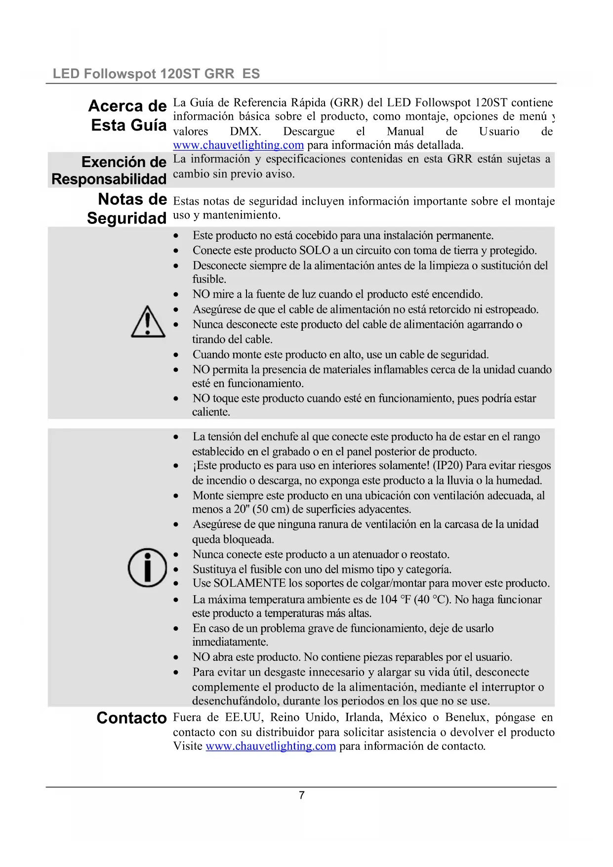 La Guía de Referencia Rápida (GRR) del LED Followspot 120ST contiene información básica sobre el producto, como montaje, opciones de menú y valores DMX. Descargue el Manual de U suario de www.chauvetlighting.com para información más detallada. Exención de Responsabilidad La información y especificaciones contenidas en esta GRR están sujetas a cambio sin previo aviso. Notas de Seguridad