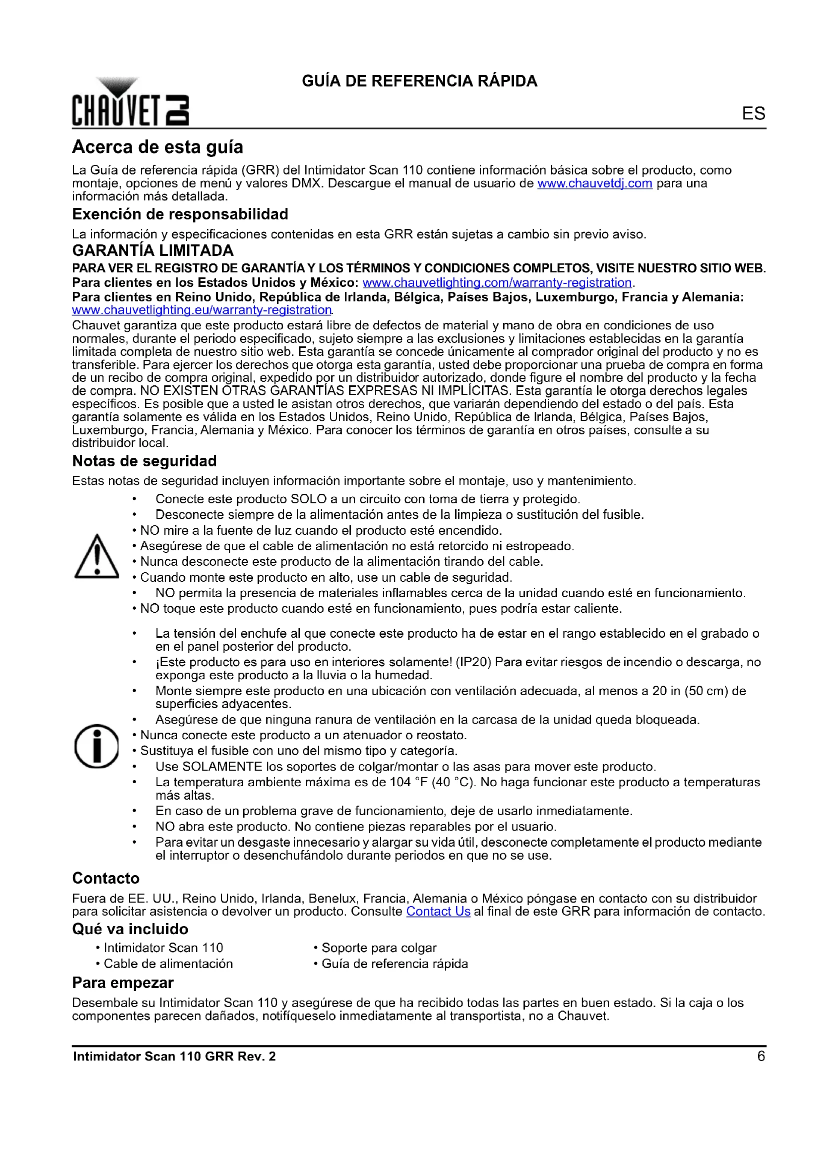 Chauvet garantiza que este producto estará libre de defectos de material y mano de obra en condiciones de uso normales, durante el periodo especificado, sujeto siempre a las exclusiones y limitaciones establecidas en la garantía limitada completa de nuestro sitio web. Esta garantía se concede únicamente al comprador original del producto y no es transferible. Para ejercer los derechos que otorga esta garantía, usted debe proporcionar una prueba de compra en forma de un recibo de compra original, expedido por un distribuidor autorizado, donde figure el nombre del producto y la fecha de compra. NO EXISTEN OTRAS GARANTÍAS EXPRESAS NI IMPLÍCITAS. Esta garantía le otorga derechos legales específicos. Es posible que a usted le asistan otros derechos, que variarán dependiendo del estado o del país. Esta garantía solamente es válida en los Estados Unidos, Reino Unido, República de Irlanda, Bélgica, Países Bajos, Luxemburgo, Francia, Alemania y México. Para conocer los términos de garantía en otros países, consulte a su distribuidor local. Notas de seguridad Estas notas de seguridad incluyen información importante sobre el montaje, uso y mantenimiento. Contacto Fuera de EE. UU., Reino Unido, Irlanda, Benelux, Francia, Alemania o México póngase en contacto con su distribuidor para solicitar asistencia o devolver un producto. Consulte Contact Us al final de este GRR para información de contacto. Qué va incluido Para empezar Desembale su Intimidator Scan 110 y asegúrese de que ha recibido todas las partes en buen estado. Si la caja o los componentes parecen dañados, notifíqueselo inmediatamente al transportista, no a Chauvet.