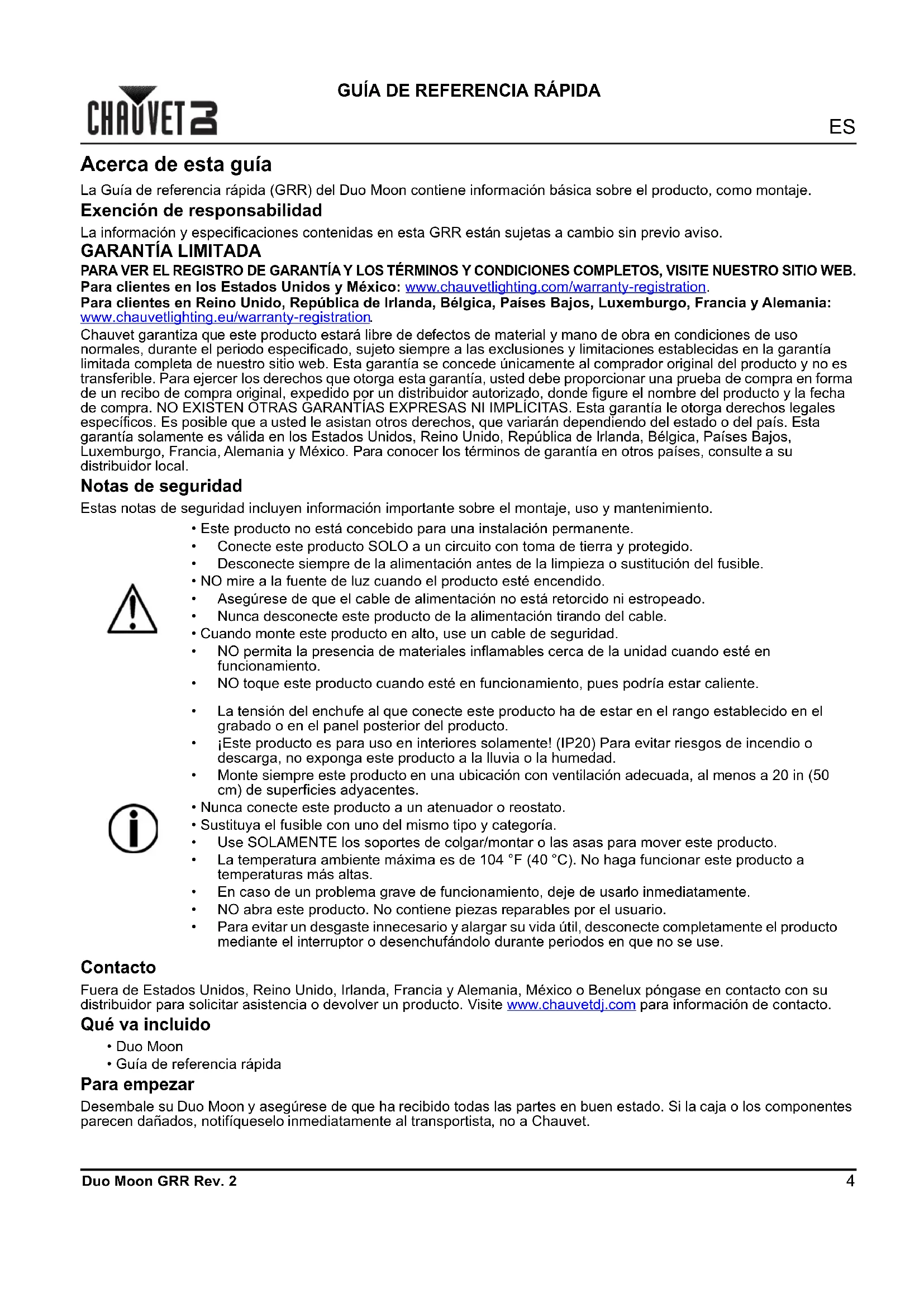 PARA VER EL REGISTRO DE GARANTÍA Y LOS TÉRMINOS Y CONDICIONES COMPLETOS, VISITE NUESTRO SITIO WEB. Para clientes en los Estados Unidos y México: www.chauvetlighting.com/warranty-registration. Para clientes en Reino Unido, República de Irlanda, Bélgica, Países Bajos, Luxemburgo, Francia y Alemania: www.chauvetlighting.eu/warranty-registration