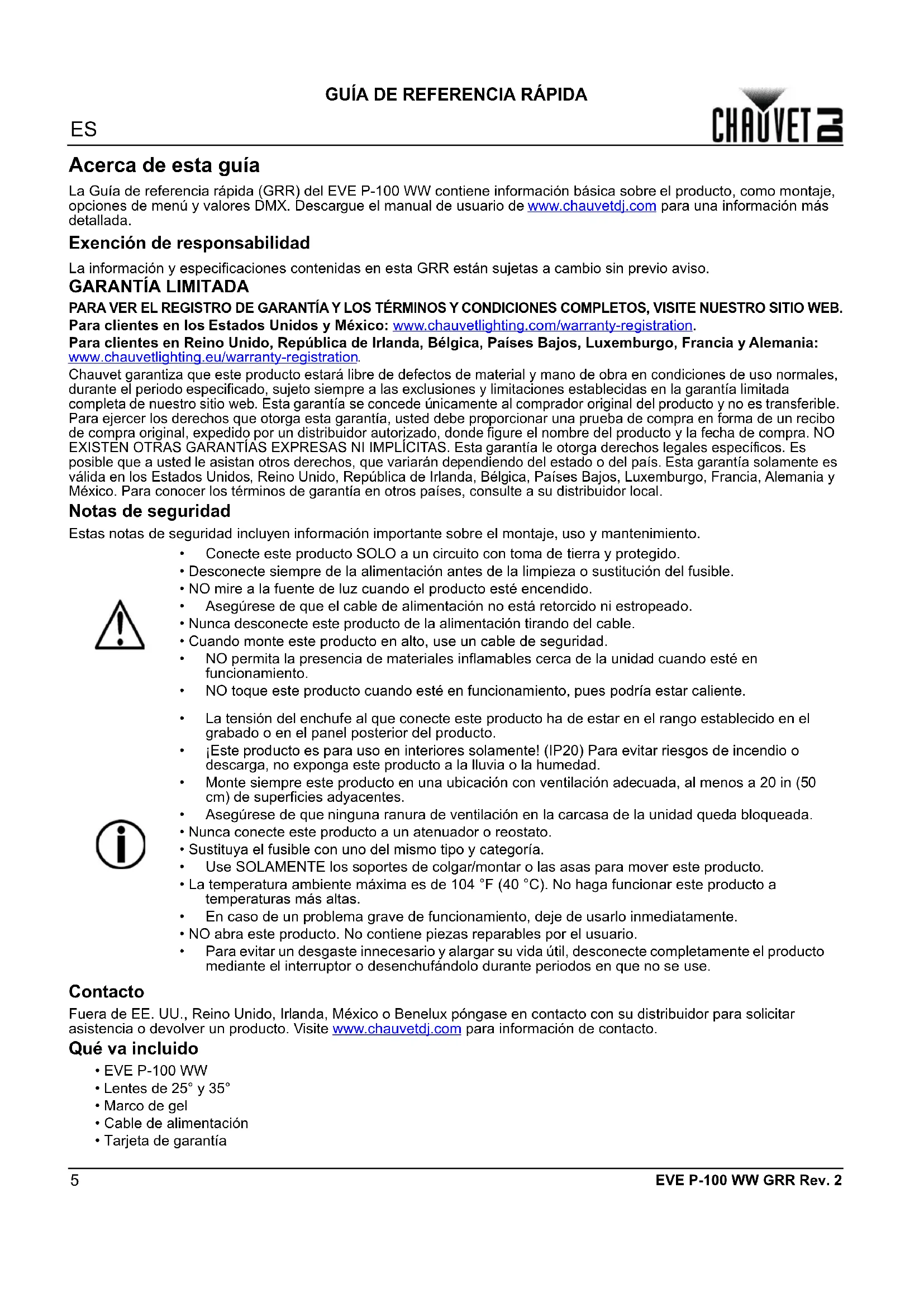 Chauvet garantiza que este producto estará libre de defectos de material y mano de obra en condiciones de uso normales, durante el periodo especificado, sujeto siempre a las exclusiones y limitaciones establecidas en la garantía limitada completa de nuestro sitio web. Esta garantía se concede únicamente al comprador original del producto y no es transferible. Para ejercer los derechos que otorga esta garantía, usted debe proporcionar una prueba de compra en forma de un recibo de compra original, expedido por un distribuidor autorizado, donde figure el nombre del producto y la fecha de compra. NO EXISTEN OTRAS GARANTÍAS EXPRESAS NI IMPLÍCITAS. Esta garantía le otorga derechos legales específicos. Es posible que a usted le asistan otros derechos, que variarán dependiendo del estado o del país. Esta garantía solamente es válida en los Estados Unidos, Reino Unido, República de Irlanda, Bélgica, Países Bajos, Luxemburgo, Francia, Alemania y México. Para conocer los términos de garantía en otros países, consulte a su distribuidor local. Notas de seguridad Estas notas de seguridad incluyen información importante sobre el montaje, uso y mantenimiento. Contacto Fuera de EE. UU., Reino Unido, Irlanda, México o Benelux póngase en contacto con su distribuidor para solicitar asistencia o devolver un producto. Visite www.chauvetdj.com para información de contacto. Qué va incluido