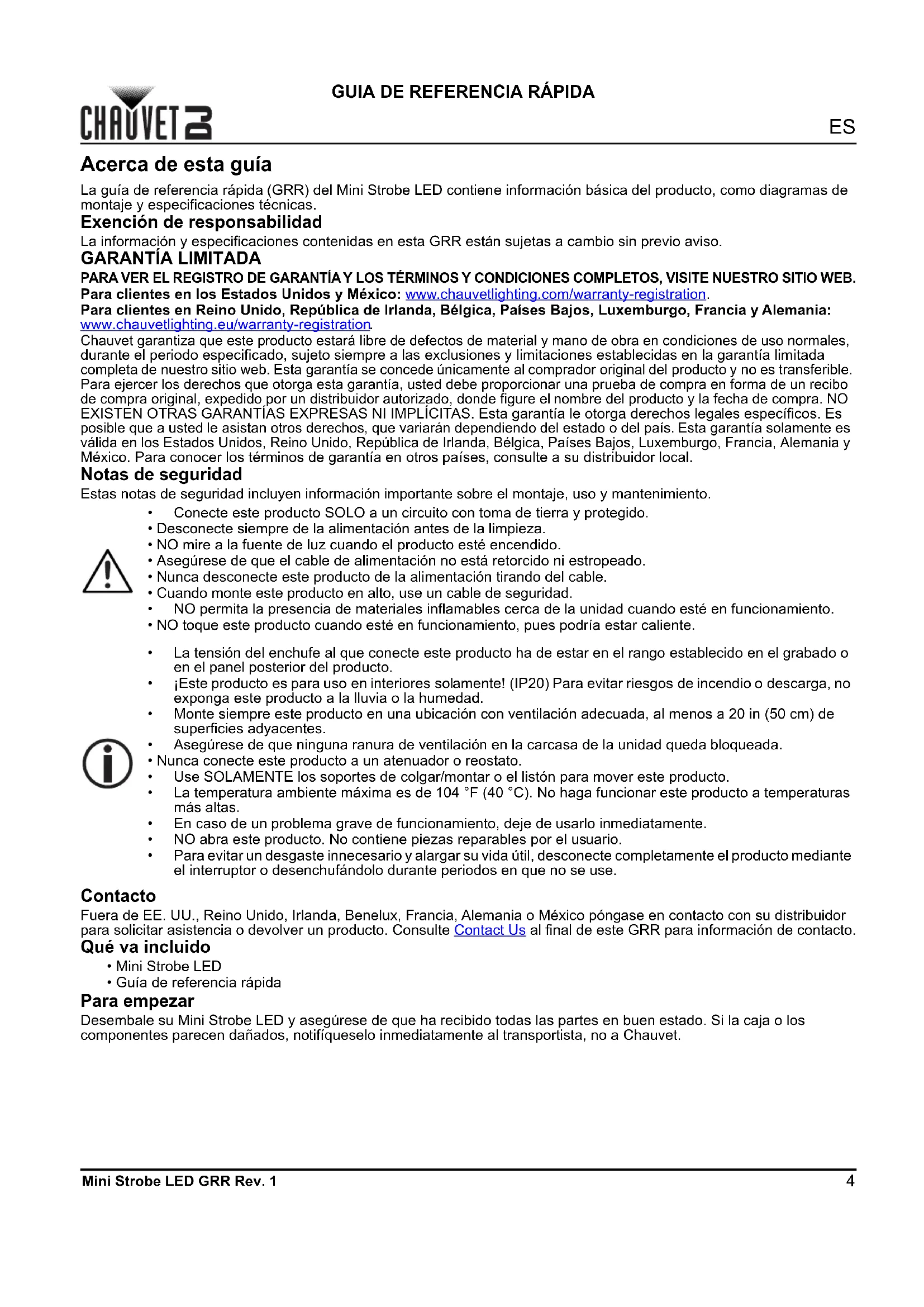 Chauvet garantiza que este producto estará libre de defectos de material y mano de obra en condiciones de uso normales, durante el periodo especificado, sujeto siempre a las exclusiones y limitaciones establecidas en la garantía limitada completa de nuestro sitio web. Esta garantía se concede únicamente al comprador original del producto y no es transferible. Para ejercer los derechos que otorga esta garantía, usted debe proporcionar una prueba de compra en forma de un recibo de compra original, expedido por un distribuidor autorizado, donde figure el nombre del producto y la fecha de compra. NO EXISTEN OTRAS GARANTÍAS EXPRESAS NI IMPLÍCITAS. Esta garantía le otorga derechos legales específicos. Es posible que a usted le asistan otros derechos, que variarán dependiendo del estado o del país. Esta garantía solamente es válida en los Estados Unidos, Reino Unido, República de Irlanda, Bélgica, Países Bajos, Luxemburgo, Francia, Alemania y México. Para conocer los términos de garantía en otros países, consulte a su distribuidor local. Notas de seguridad Estas notas de seguridad incluyen información importante sobre el montaje, uso y mantenimiento. Contacto Fuera de EE. UU., Reino Unido, Irlanda, Benelux, Francia, Alemania o México póngase en contacto con su distribuidor para solicitar asistencia o devolver un producto. Consulte Contact Us al final de este GRR para información de contacto. Qué va incluido Para empezar Desembale su Mini Strobe LED y asegúrese de que ha recibido todas las partes en buen estado. Si la caja o los componentes parecen dañados, notifíqueselo inmediatamente al transportista, no a Chauvet.