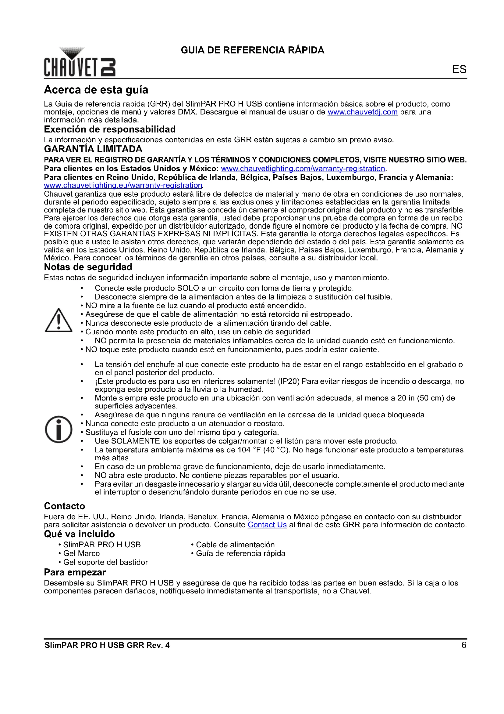 Chauvet garantiza que este producto estará libre de defectos de material y mano de obra en condiciones de uso normales, durante el periodo especificado, sujeto siempre a las exclusiones y limitaciones establecidas en la garantía limitada completa de nuestro sitio web. Esta garantía se concede únicamente al comprador original del producto y no es transferible. Para ejercer los derechos que otorga esta garantía, usted debe proporcionar una prueba de compra en forma de un recibo de compra original, expedido por un distribuidor autorizado, donde figure el nombre del producto y la fecha de compra. NO EXISTEN OTRAS GARANTÍAS EXPRESAS NI IMPLÍCITAS. Esta garantía le otorga derechos legales específicos. Es posible que a usted le asistan otros derechos, que variarán dependiendo del estado o del país. Esta garantía solamente es válida en los Estados Unidos, Reino Unido, República de Irlanda, Bélgica, Países Bajos, Luxemburgo, Francia, Alemania y México. Para conocer los términos de garantía en otros países, consulte a su distribuidor local. Notas de seguridad Estas notas de seguridad incluyen información importante sobre el montaje, uso y mantenimiento. Contacto Fuera de EE. UU., Reino Unido, Irlanda, Benelux, Francia, Alemania o México póngase en contacto con su distribuidor para solicitar asistencia o devolver un producto. Consulte Contact Us al final de este GRR para información de contacto. Qué va incluido Para empezar Desembale su SlimPAR PRO H USB y asegúrese de que ha recibido todas las partes en buen estado. Si la caja o los componentes parecen dañados, notifíqueselo inmediatamente al transportista, no a Chauvet.