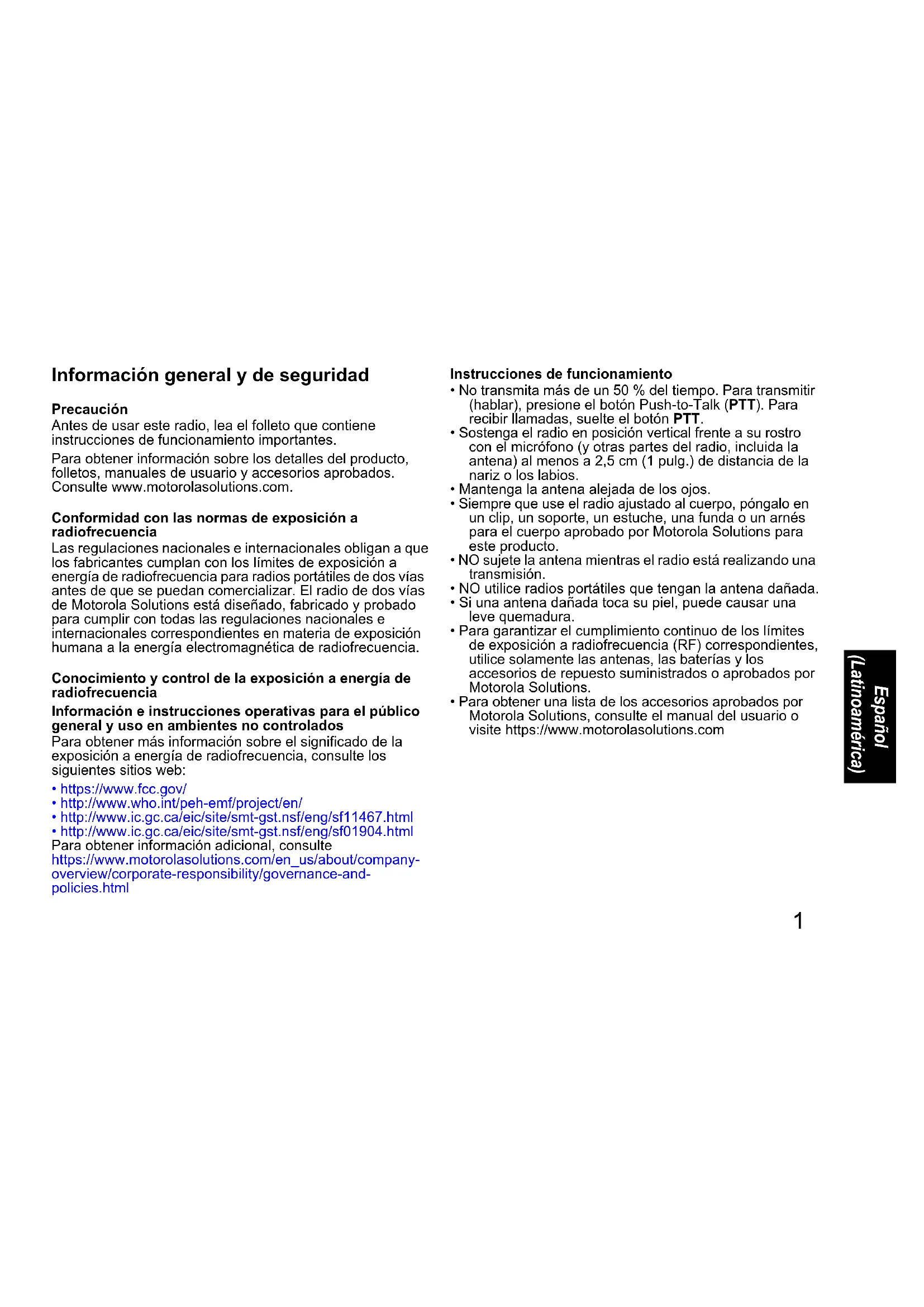 - Para garantizar el cumplimiento continuo de los límites de exposición a radiofrecuencia (RF) correspondientes, utilice solamente las antenas, las baterías y los accesorios de repuesto suministrados o aprobados por Motorola Solutions.