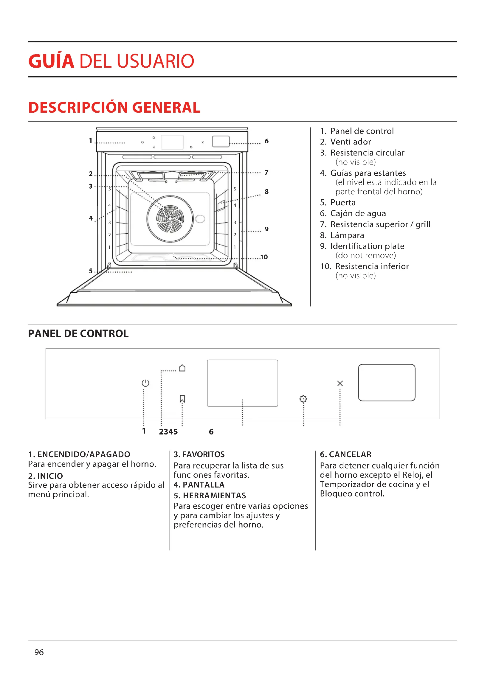 ASISTENCIA 11796 1 Panel de control 2 Ventilador 3 Resistencia circular (no visible) 4 Guías para estantes (el nivel está indicado en la parte frontal del horno) 5 Puerta 6 Cajón de agua 7 Resistencia superior / grill 8 Lámpara 9 Identification plate (do not remove) 10 Resistencia inferior (no visible)