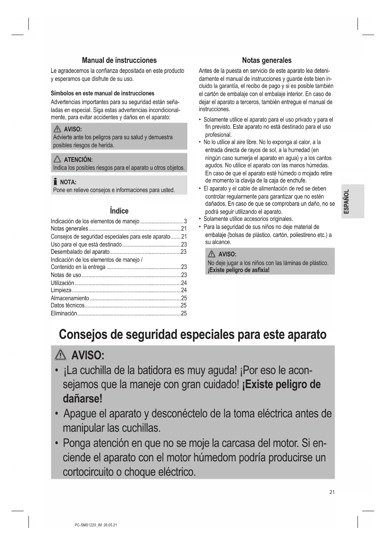 - Procese solamente alimentos con este aparato. Un mal uso del aparato o usarlo para otros nes puede causar lesiones. ATENCIÓN: No corte ingredientes muy duros con este aparato, tales como cu- bitos, nuez moscada o trozos grandes de chocolate para cocinar. ¡La cuchilla se podría estropear!PC-SMS1220_IM 26.05.21