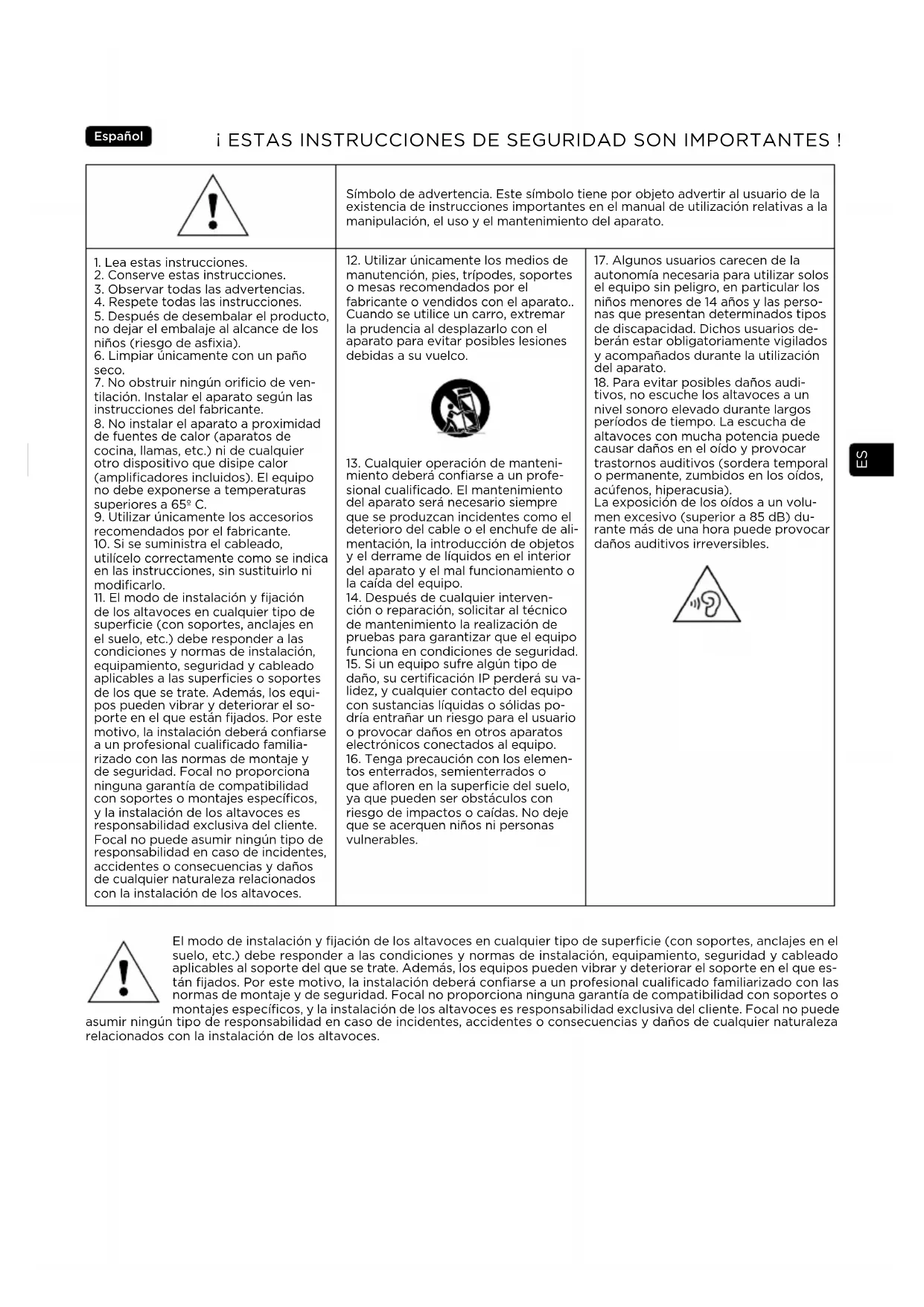 tivos, no escuche los altavoces a un nivel sonoro elevado durante largos períodos de tiempo. La escucha de altavoces con mucha potencia puede causar daños en el oído y provocar trastornos auditivos (sordera temporal o permanente, zumbidos en los oídos, acúfenos, hiperacusia). La exposición de los oídos a un volu- men excesivo (superior a 85 dB) du- rante más de una hora puede provocar daños auditivos irreversibles. El modo de instalación y fijación de los altavoces en cualquier tipo de superficie (con soportes, anclajes en el suelo, etc.) debe responder a las condiciones y normas de instalación, equipamiento, seguridad y cableado aplicables al soporte del que se trate. Además, los equipos pueden vibrar y deteriorar el soporte en el que es- tán fijados. Por este motivo, la instalación deberá confiarse a un profesional cualificado familiarizado con las normas de montaje y de seguridad. Focal no proporciona ninguna garantía de compatibilidad con soportes o montajes específicos, y la instalación de los altavoces es responsabilidad exclusiva del cliente. Focal no puede asumir ningún tipo de responsabilidad en caso de incidentes, accidentes o consecuencias y daños de cualquier naturaleza relacionados con la instalación de los altavoces.ES