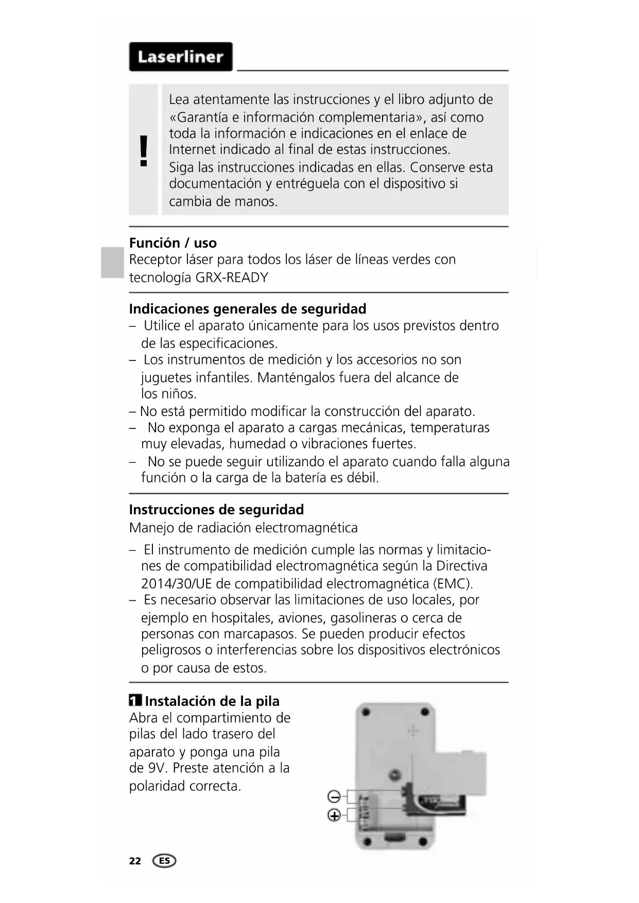 Indicaciones generales de seguridad – Utilice el aparato únicamente para los usos previstos dentro de las especicaciones. – Los instrumentos de medición y los accesorios no son juguetes infantiles. Manténgalos fuera del alcance de los niños. – No está permitido modicar la construcción del aparato. – No exponga el aparato a cargas mecánicas, temperaturas muy elevadas, humedad o vibraciones fuertes. – No se puede seguir utilizando el aparato cuando falla alguna función o la carga de la batería es débil. Instrucciones de seguridad Manejo de radiación electromagnética – El instrumento de medición cumple las normas y limitacio- nes de compatibilidad electromagnética según la Directiva 2014/30/UE de compatibilidad electromagnética (EMC). – Es necesario observar las limitaciones de uso locales, por ejemplo en hospitales, aviones, gasolineras o cerca de personas con marcapasos. Se pueden producir efectos peligrosos o interferencias sobre los dispositivos electrónicos o por causa de estos. ESRangeXtender G 30